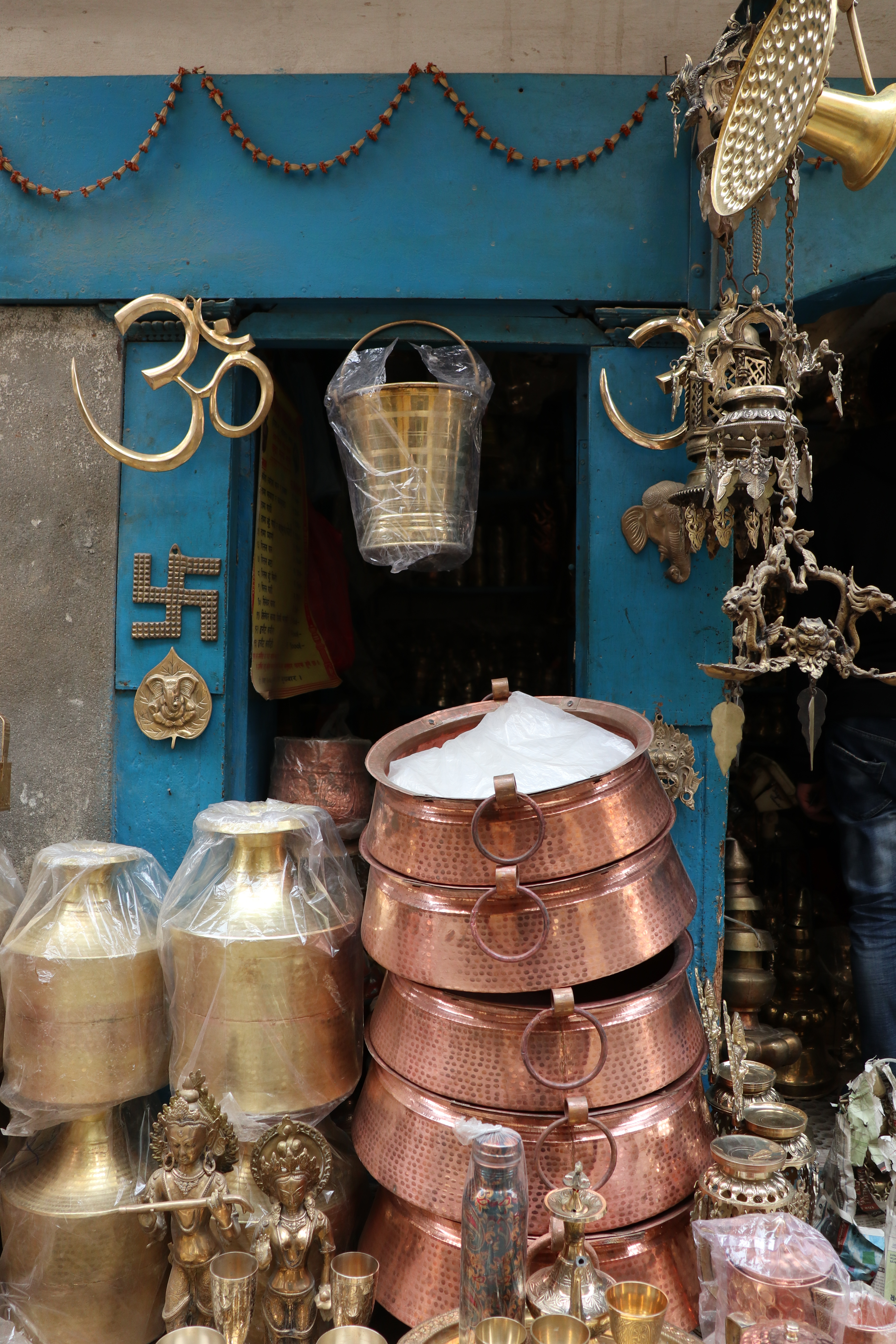 I head back out onto the streets and then I find the Golden Temple, which is an ornate temple bedecked with golden and brass decorations and statues. A large group of Japanese tourists is milling around, and I wait until they have gone before I start taking pictures. I love the details and the colours and the tika. Tika becomes a new focal point for me in the pictures that I take. There is just something about the contrast of the bright colours and textures of the powder against the darker colours of the bronze and brass objects.