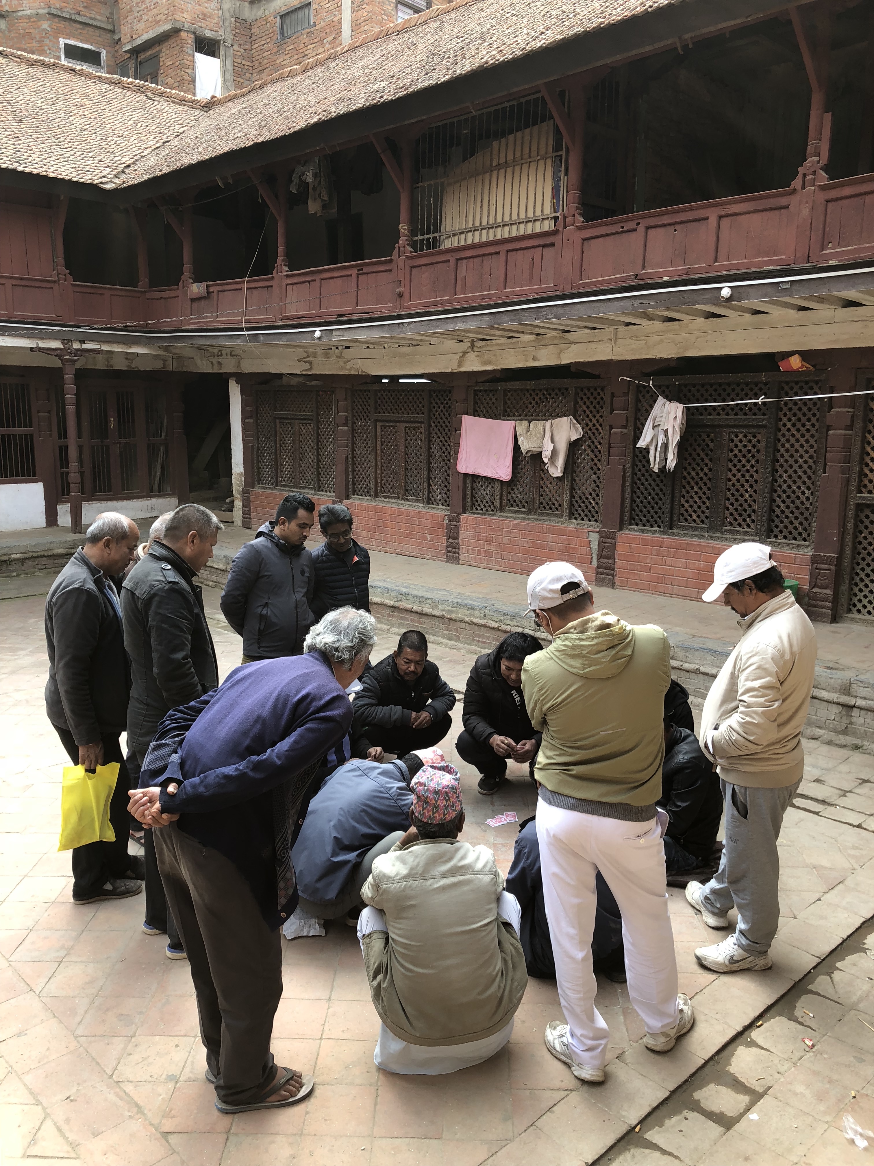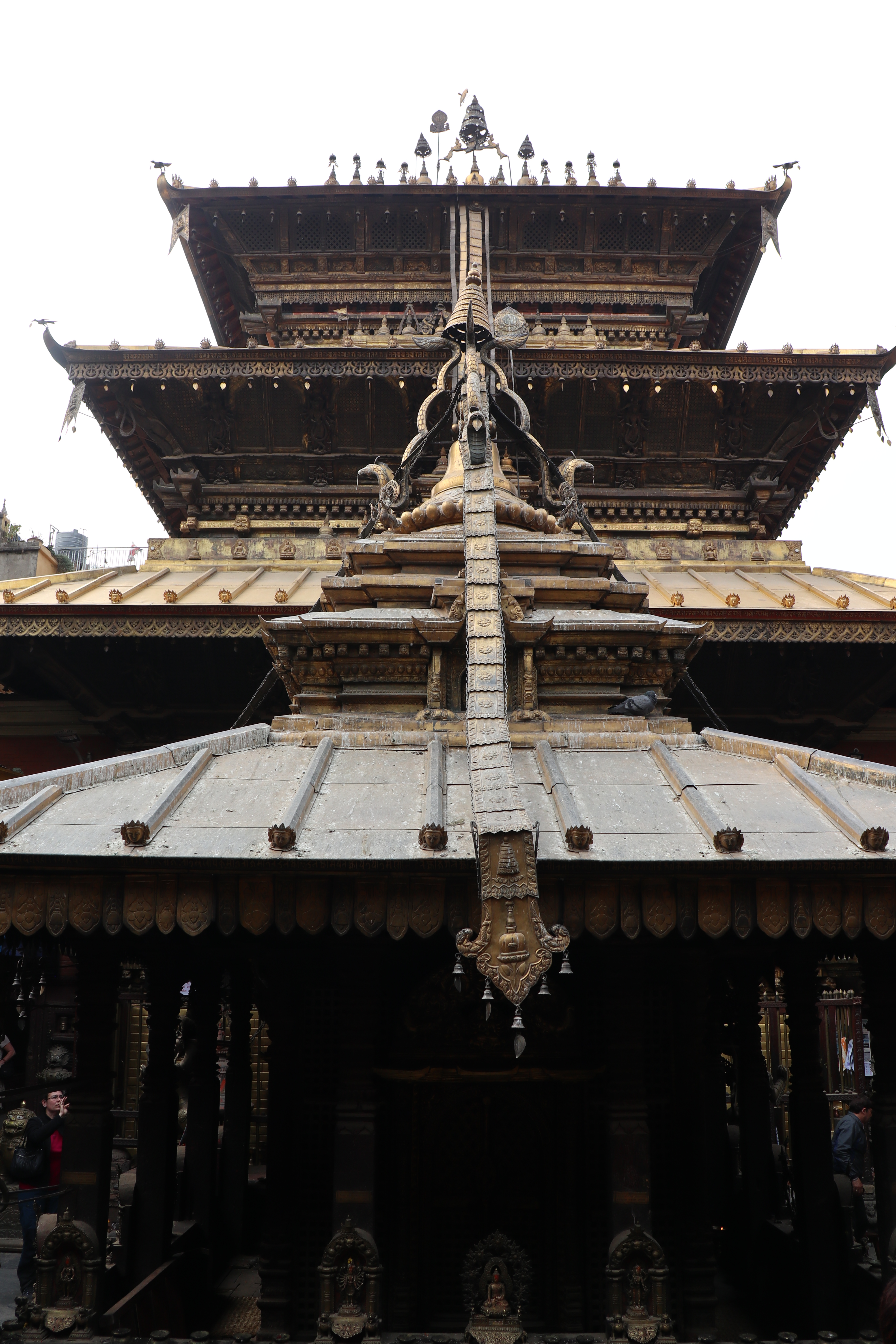 The Newari style of Nepalese architecture stands out a lot more in Patan. Maybe because it isn’t as big and as seething and frenetic as Kathmandu is. The carved window and door frames are more on display, and I love the intricate details. I stop in at a small courtyard that is typical of the style. Some men are playing a game in there and I try not to disturb them. At times it’s nice to play the foreigner card and to show interest and join in with things, but at times like this I always think it is better to hold back and not get in the way. There is a small temple in the middle of the courtyard but a lot of signs of earthquake damage are visible, like the long wooden props holding up the houses.