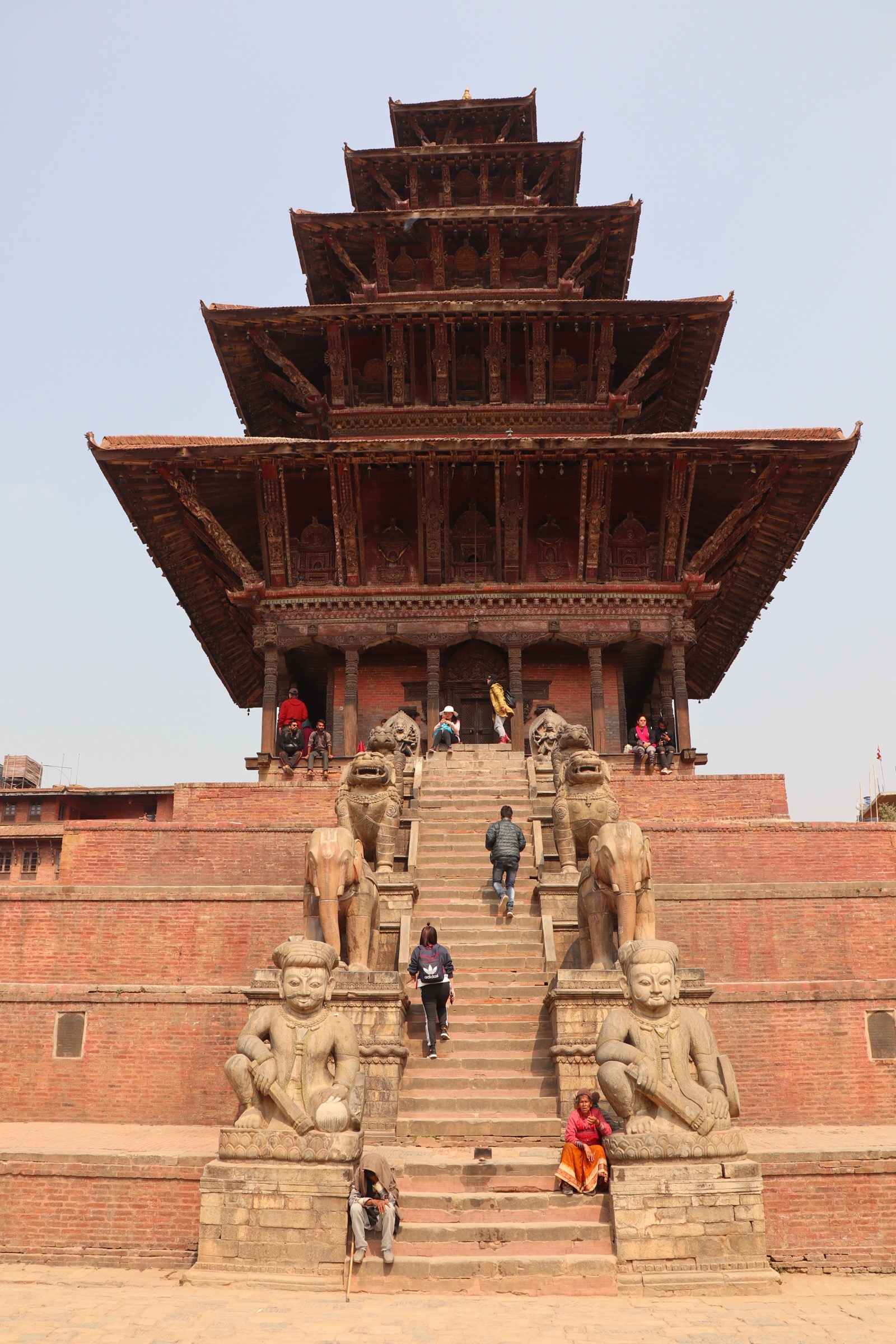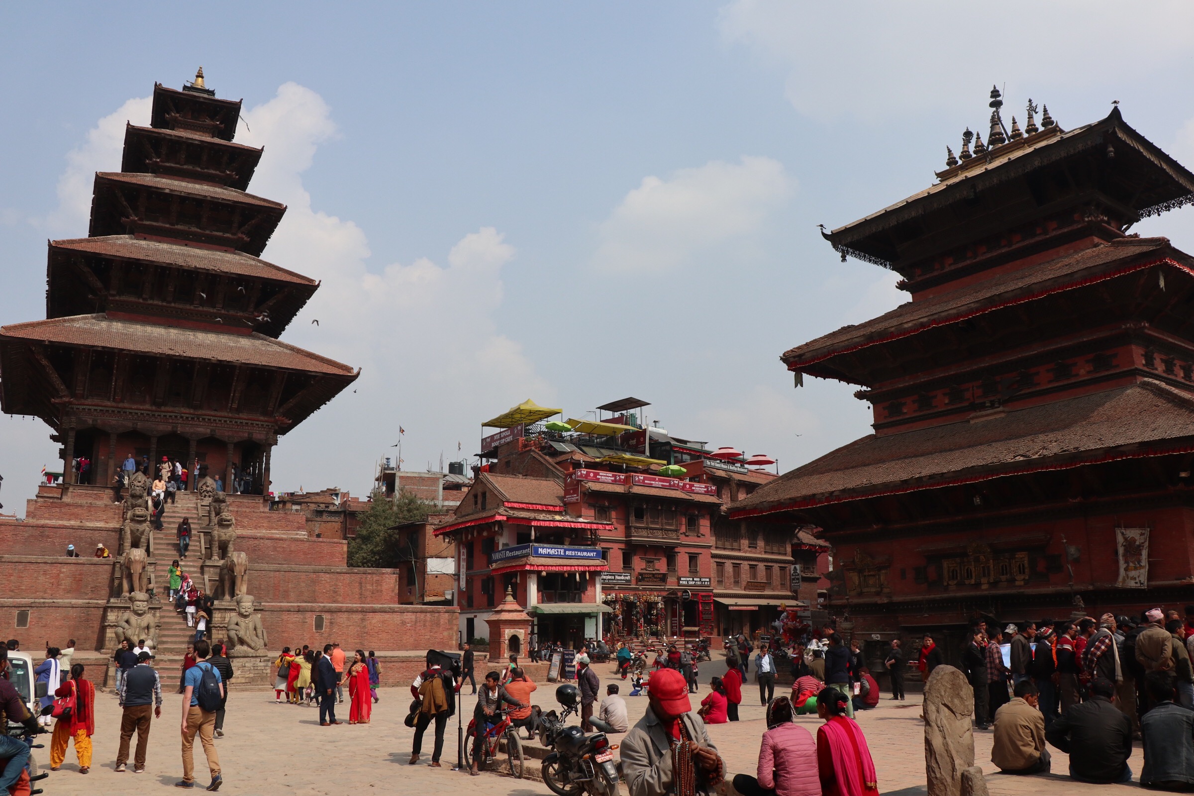 Roughly two minutes later I’m in Thaumadi Square, home to Nyatapola Temple, the tallest temple in the Kathmandu Valley. The square is wide and open, and tourists groups and Nepalis are milling around. I’m rather more impressed by this square than the Durbar Squares in Kathmandu and Nepal, and I immediately get my camera out and climb the steps to the top to take in the view. People are just hanging about at the top. Motorbikes zip in and out of the square. Across the square there is a small but bustling marketplace, and there is another temple to the east. There’s a lot going on.