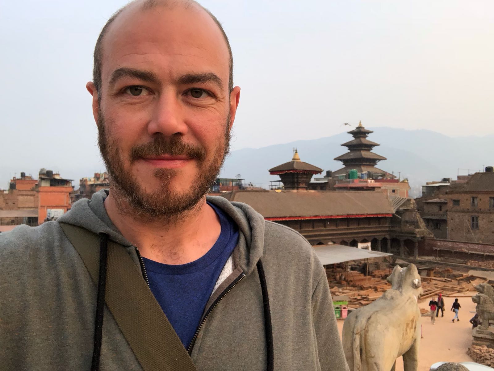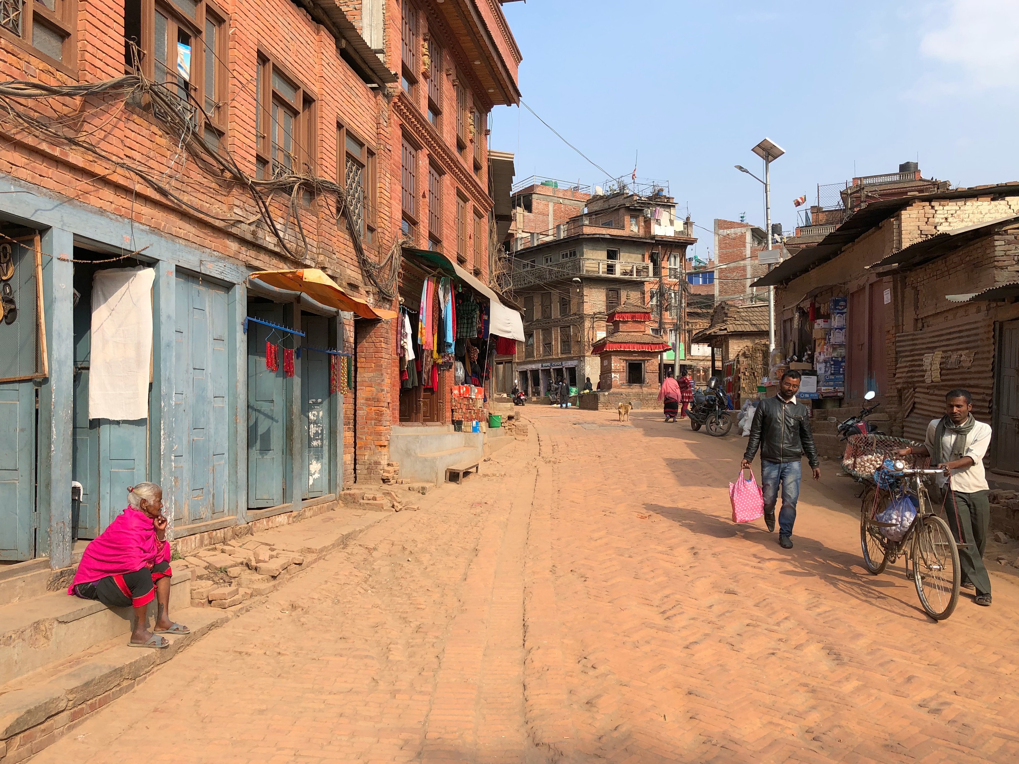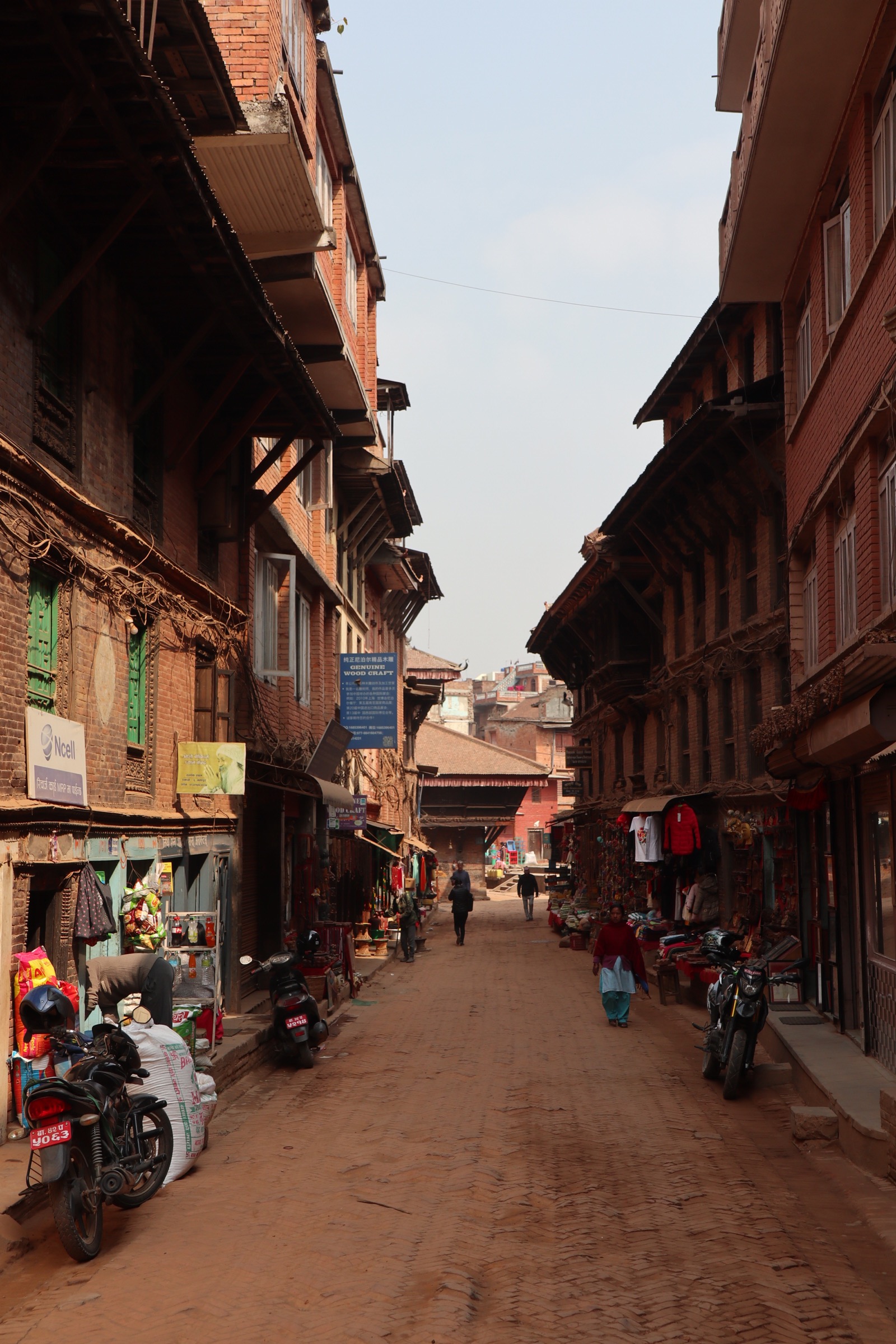 Morning in Bhaktapur. I’ve had a great sleep, and now I’m hungry so I head up to the rooftop to eat breakfast. It’s still hazy out there, and I’ve learnt by now that the mountains I can just about make out through the haze are definitely not the Himalayas in any capacity. Om, the receptionist boy who checked me in yesterday and lugged my suitcase up to my room is in the kitchen cooking breakfast, and Suresh is busying himself taking photos of the guests to put on booking.com (the hotel has only recently opened). There’s no choice of what you get for breakfast; it’s one thing only, and luckily it’s delicious. I get an egg cooked into the salty lentil pancakes I watched some women making in the streets of Kathmandu, and it’s so good I ask for another.