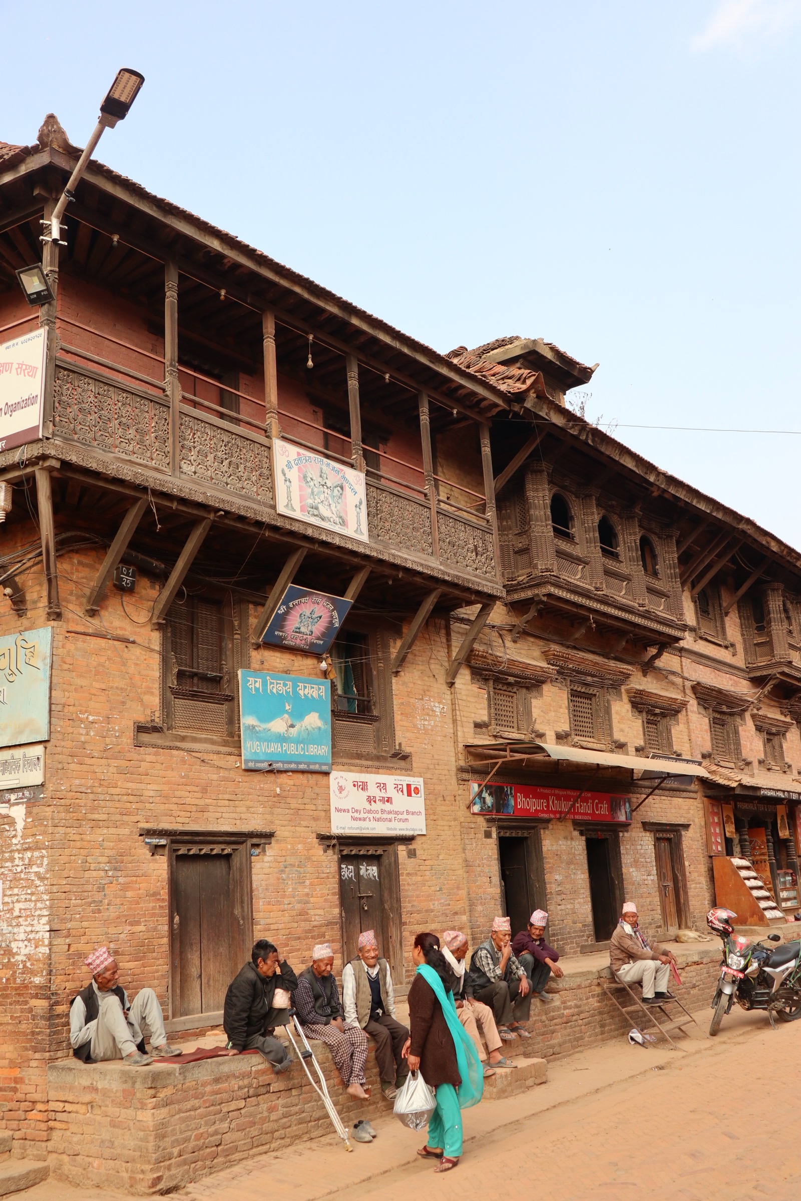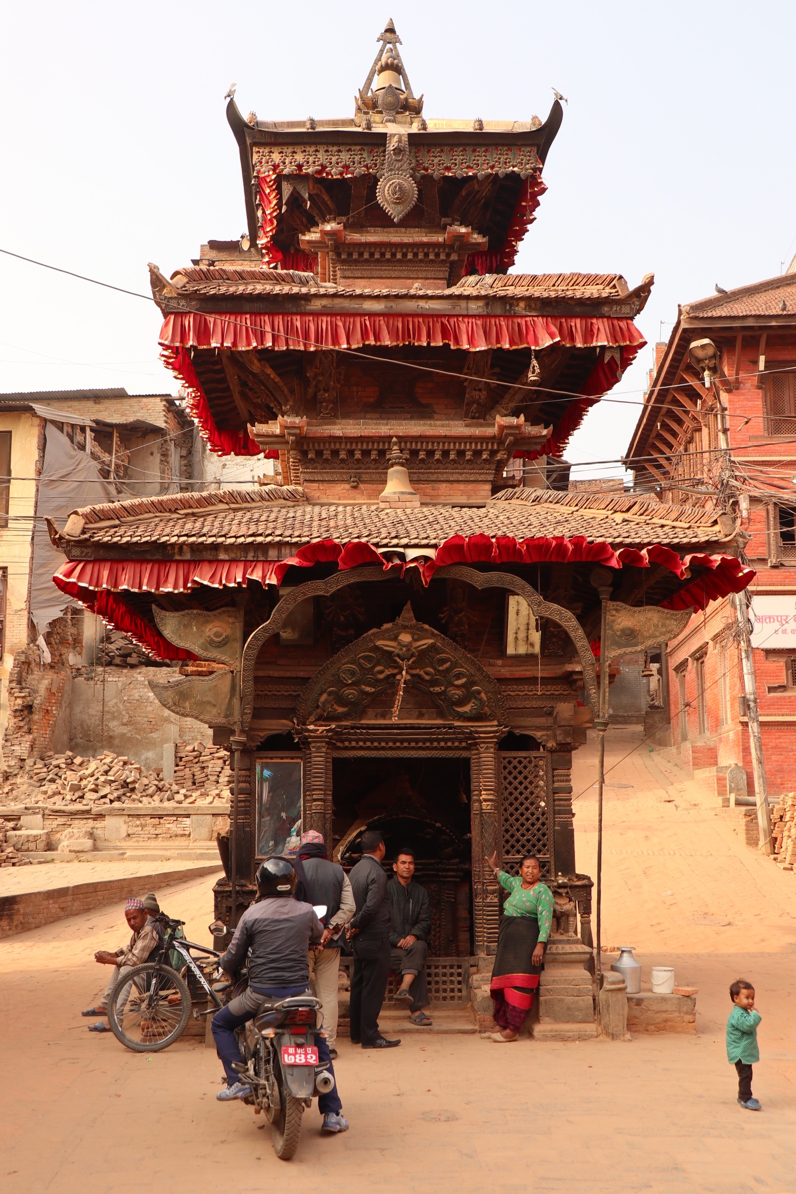 Today, then, it’s time to explore the other parts of Bhaktapur that I didn’t see yesterday. First I make my way back to Thaumadi Square, which by this time in the morning is once again filled with people and tour groups clambering up and down the steps of Nayatapola Temple. I make my way down the market street I walked a bit along yesterday and head towards Dattatreya Square. The street is lovely, with its overhanging Newa carving buildings and temples dotted along the way.