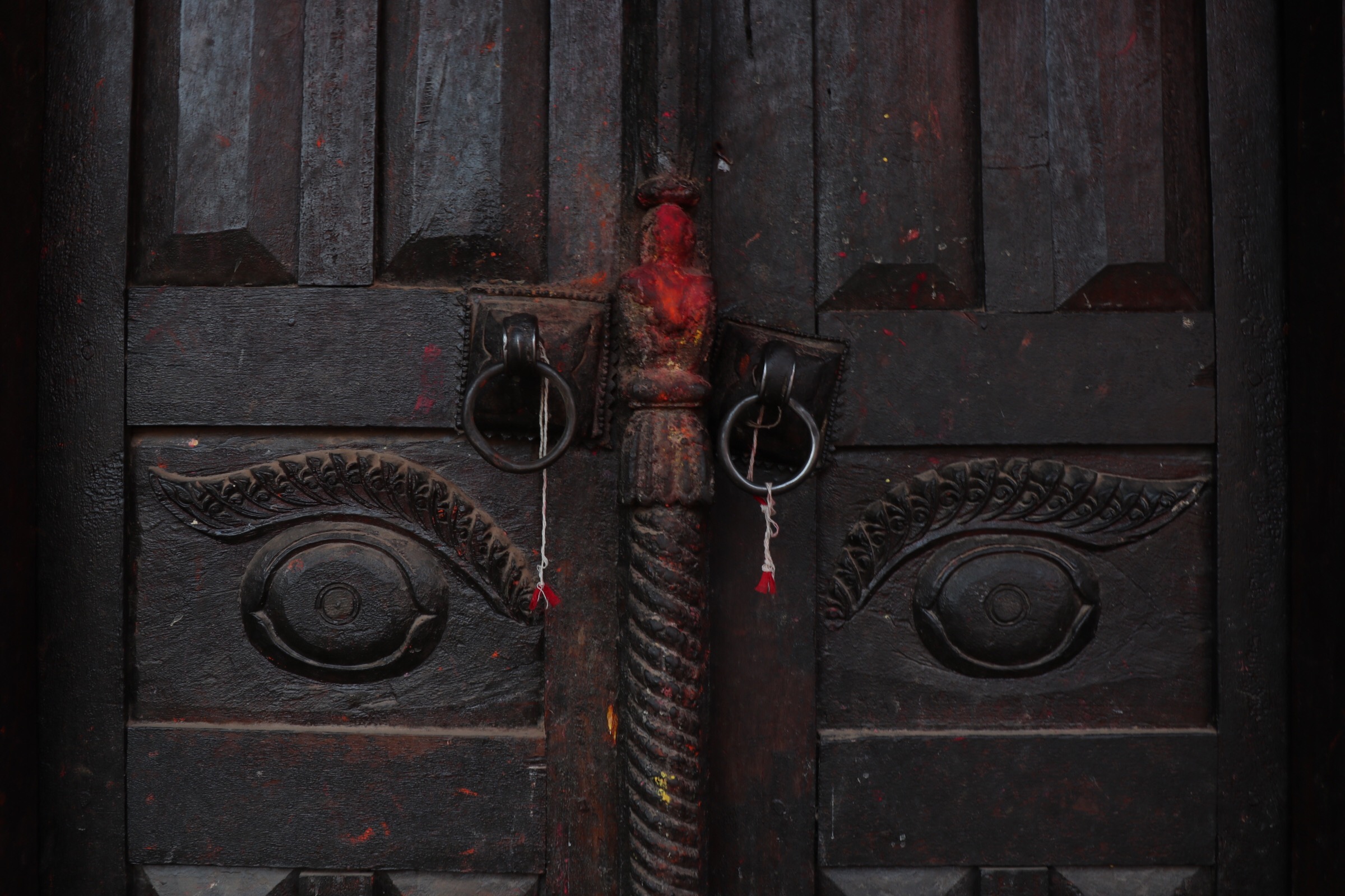 I spend a few minutes wandering around, taking some more shots, and then make my way back down a side street. It is only afterwards that I realise that I have just seen Dattatreya Square, which is one of the most important squares in Bhaktapur. Oops. You’ll be glad to know that I came back later on when I passed through Bhaktapur en route to Pokhara and stayed another night after going to Nagarkot; I spent an afternoon thoroughly appreciating the square, and for brevity’s sake I’m including some of the photos I took later here in this post. As I’ve mentioned in previous posts, I was really taken with the bright colours of the tika that is splashed about everywhere, and one of my most favourite pictures I took on the entire trip was taken that afternoon: I call this one Eye’ll Be Watching You. There’s certainly no evils getting through that door…