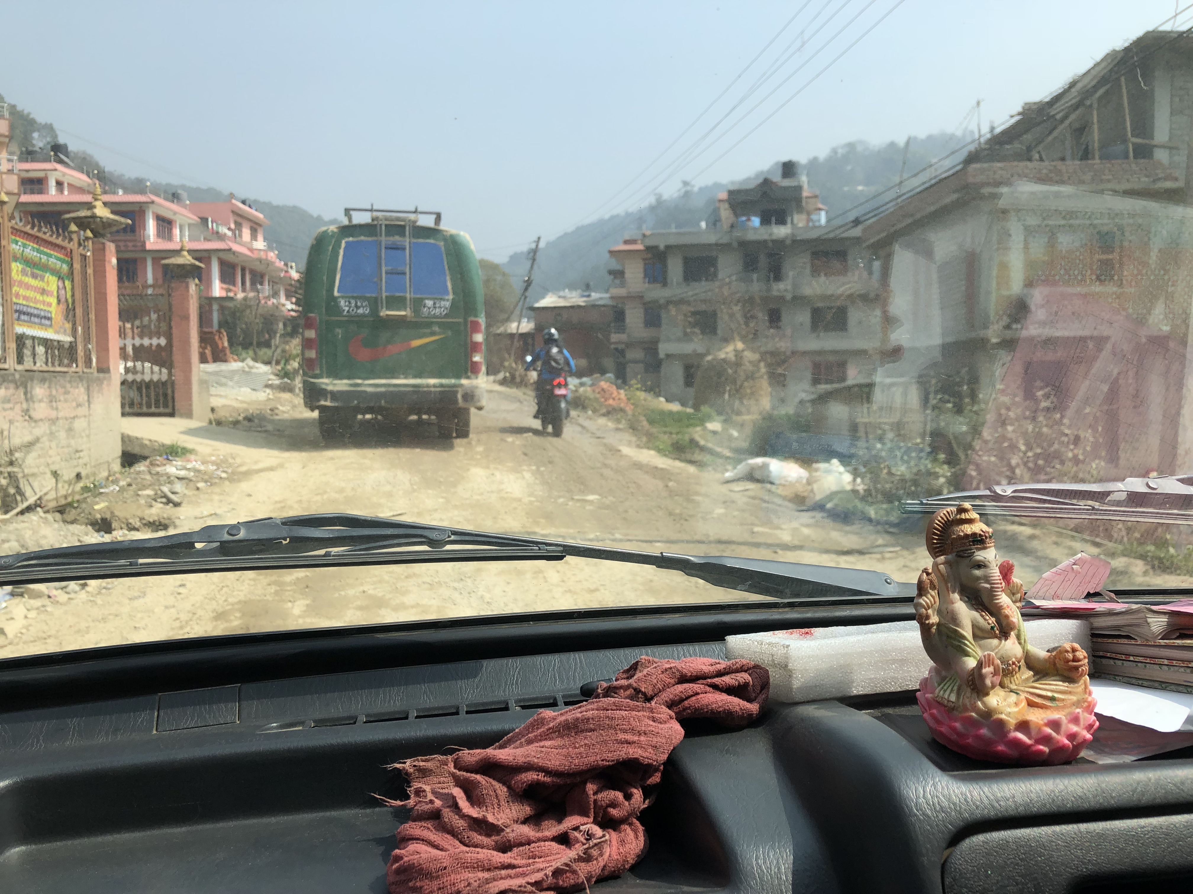 Not helping matters is that we are stuck behind a bus. A large green bus with a Nike swoosh on the back that is belching out black smoke. The driver keeps attempting to see around the bus to see if he can overtake it. Since the road surface is at times non-existent, or sometimes just a sliver of tarmac that has survived a landslide, this results in many bumps and jolts and crashes. Making me more nervous is the fact that the little statue of Ganesh that sits on top of the centre console topples over roughly every 30 seconds. Each time it does so, the driver takes his left hand off the steering wheel (his mobile still being clasped to his ear in his right hand) to set it upright again.