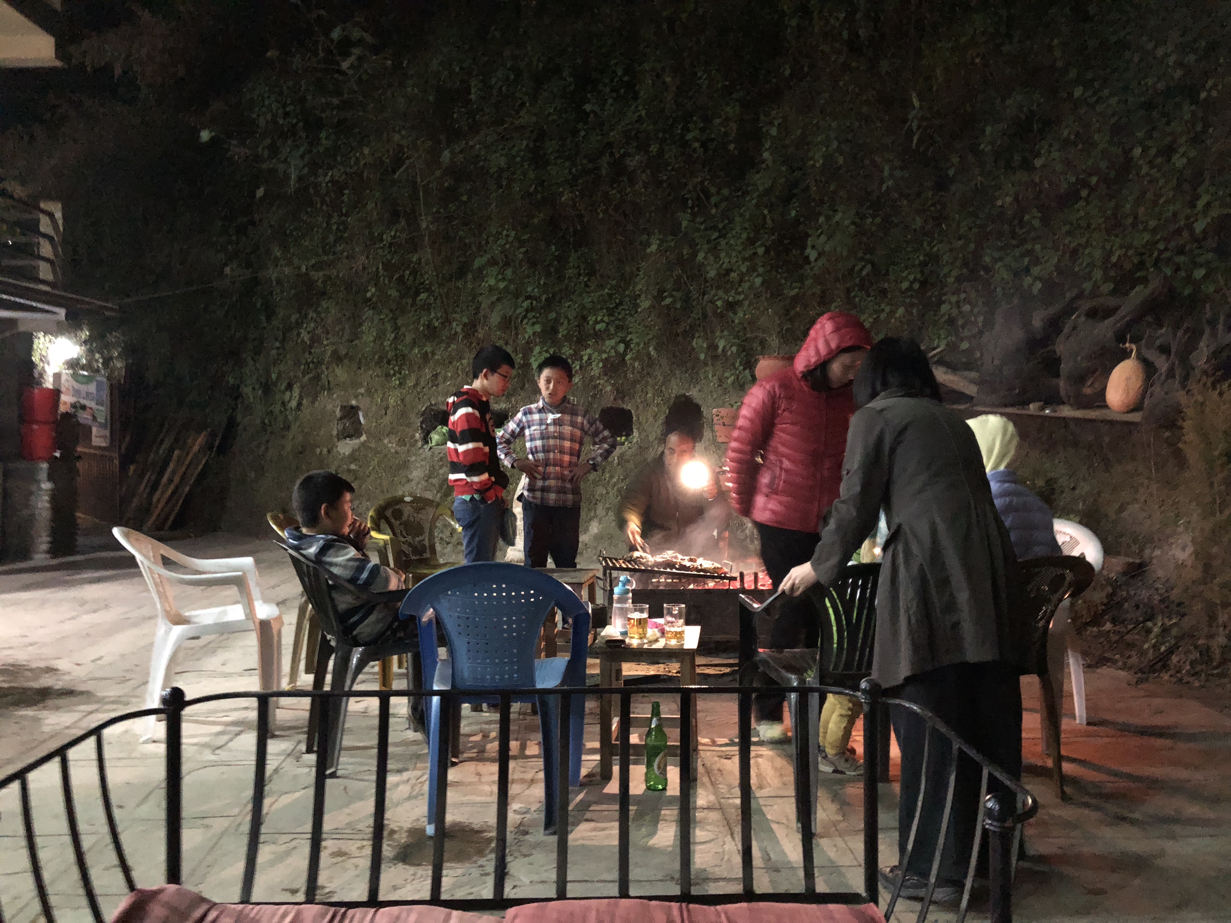 Darkness has almost fallen by the time I get back to the hotel. There is a little patio area behind it, and people are sitting outside eating food and drinking beer. By now the temperatures have really dropped and it is cold. I’m suddenly freezing, but then I guess we are at quite a high altitude. The hotel chap invites me to sit by the barbecue the hotel has set up. There is a specials board outside the hotel advertising their 700-rupee ($7) barbecue dinner. I have declined it, since I had already eaten on the way back and it’s about three times more than I have usually paid for any meal in Nepal, but it’s lovely to sit by the fire and warm up. A Nepali couple are eating the meal and it looks pretty good, to be fair.