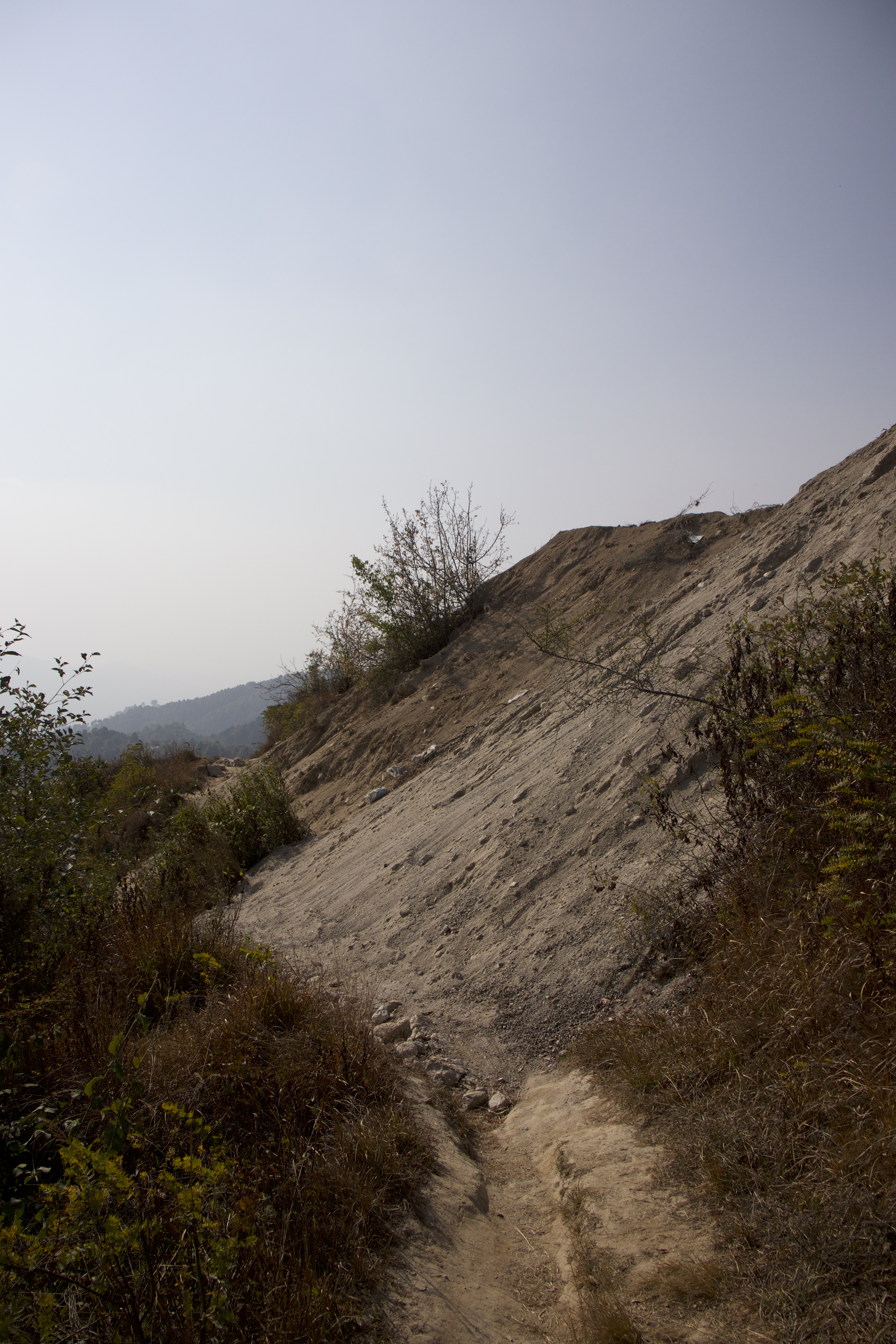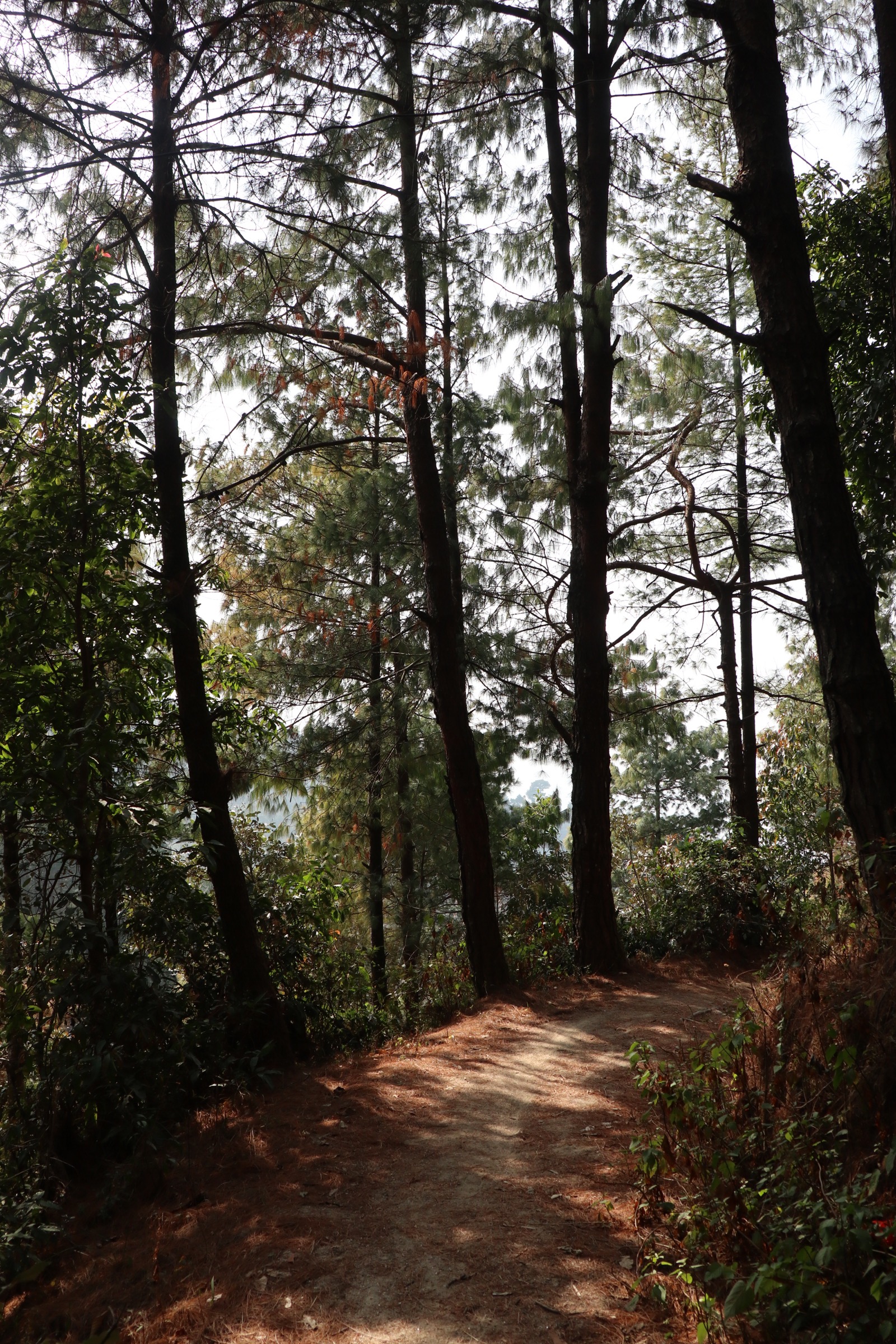 I take a stroll along one of the streets leading out of the town. I’ve read that there is a hiking trail through the woods that leads to the Nagarkot View Tower, supposedly the point from which one can see the Himalayas. A couple of hundred metres up the street on the left, there is a large green sign saying Tourist Trail. It has a map of trails through the woods. I take a quick photo and set off down the sandy path and into the trees.