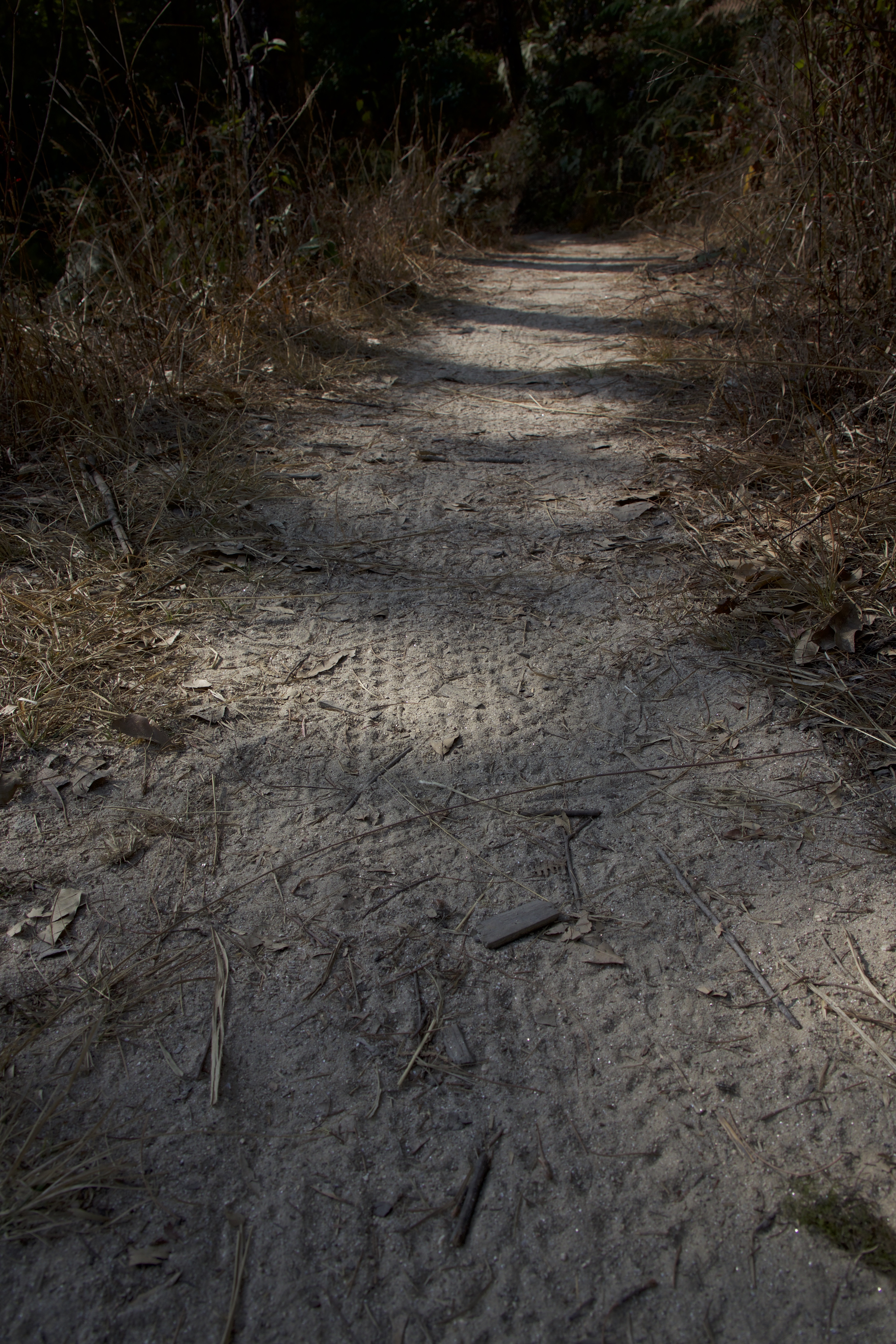 I carry on. The path starts to go further up towards the top of the ridge above me, and I can still see and hear the road. I’m encouraged, if not a little tired by now. Around a headland I go, and then I find an extraordinary sight. I have encountered a quarry, and below me there are large industrial diggers and machinery. This would explain the trucks passing along the road. I’m not too far down from the road, but the paths have turned to sand and gravel, and it’s quite the task to climb up them as with each step I take the earth shifts and spills downwards. With my coat on my shoulder and my camera in my hand, it’s a bit of a job to hold onto trees and branches, but I make it, and I get a few weird looks from a group of construction workers standing around a large yellow digger on the road.