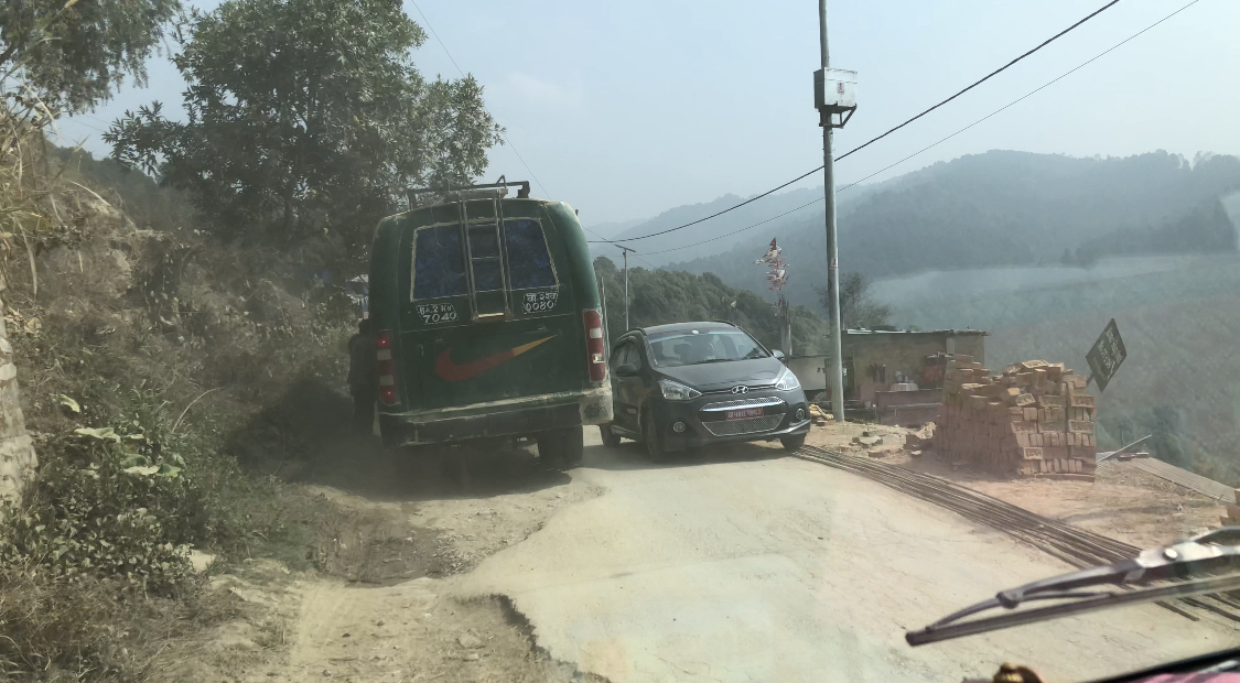 Atrociouser? More atricious? Whatever it is, it doesn’t even come close to describing these roads that I’m currently bumping and jolting along as we wind our way up into the mountains towards Nagarkot. I’m squeezed into front seat of a tiny little van. The driver is holding one of his two mobile phones to his right ear and both steering and changing gear with his left hand. The “road surface” disappears in places, replaced by muddy patches of sand and grit that slope down towards ditches on the left and toward a sheer drop down the mountainside to the right, jolting the van into 45-degree angles at times. Since I’m roughly three times heavier than the driver, I’m sure that the weight of me on one side of the van is going to make us topple over, but no. Luckily, since Nepal drives on the correct side of the road (the left) and I’m in the passenger seat, I can’t actually see what the drop is like, but damn, I know I’m gonna see it when we come back down this wretched road, and I’m put in mind of Jeremy Clarkson trying to squeeze a Range Rover past a truck on the Death Road in Bolivia on Top Gear.