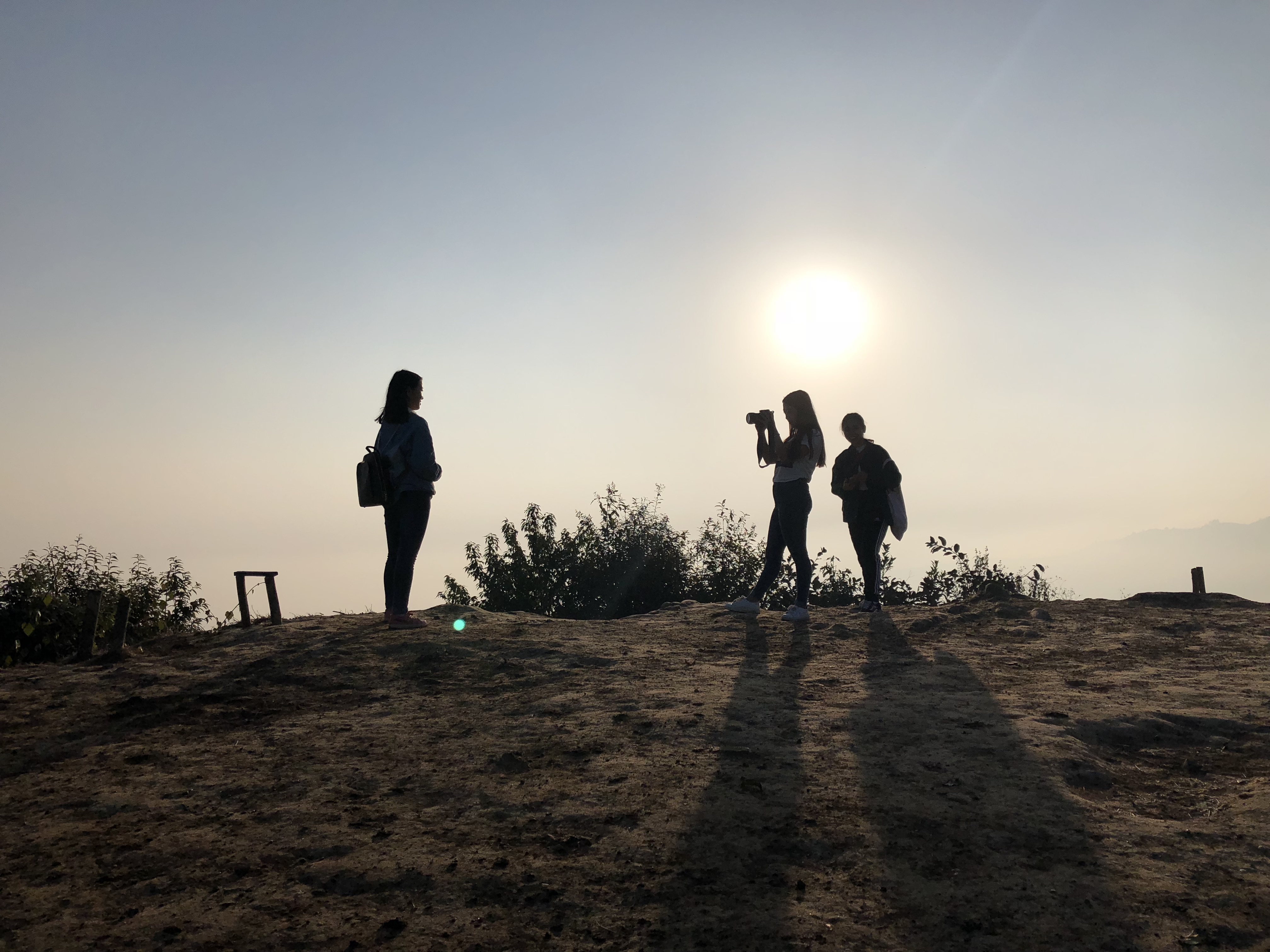 I start talking to the Belgian couple that are still here. I take a photo for them and they insist that I have my photo taken by them. I’m not usually into having my picture taken, cos I prefer the selfie crop of cutting out my lumps and bumps and just having my head and shoulders in the pic. They’re on a three-month break from uni and travelling with a bunch of friends who were too lazy to get up this morning and come to see the sunrise. We chat for a while and they head off. They’ve got a van coming to pick up their group in an hour and are heading off to Pokhara.
