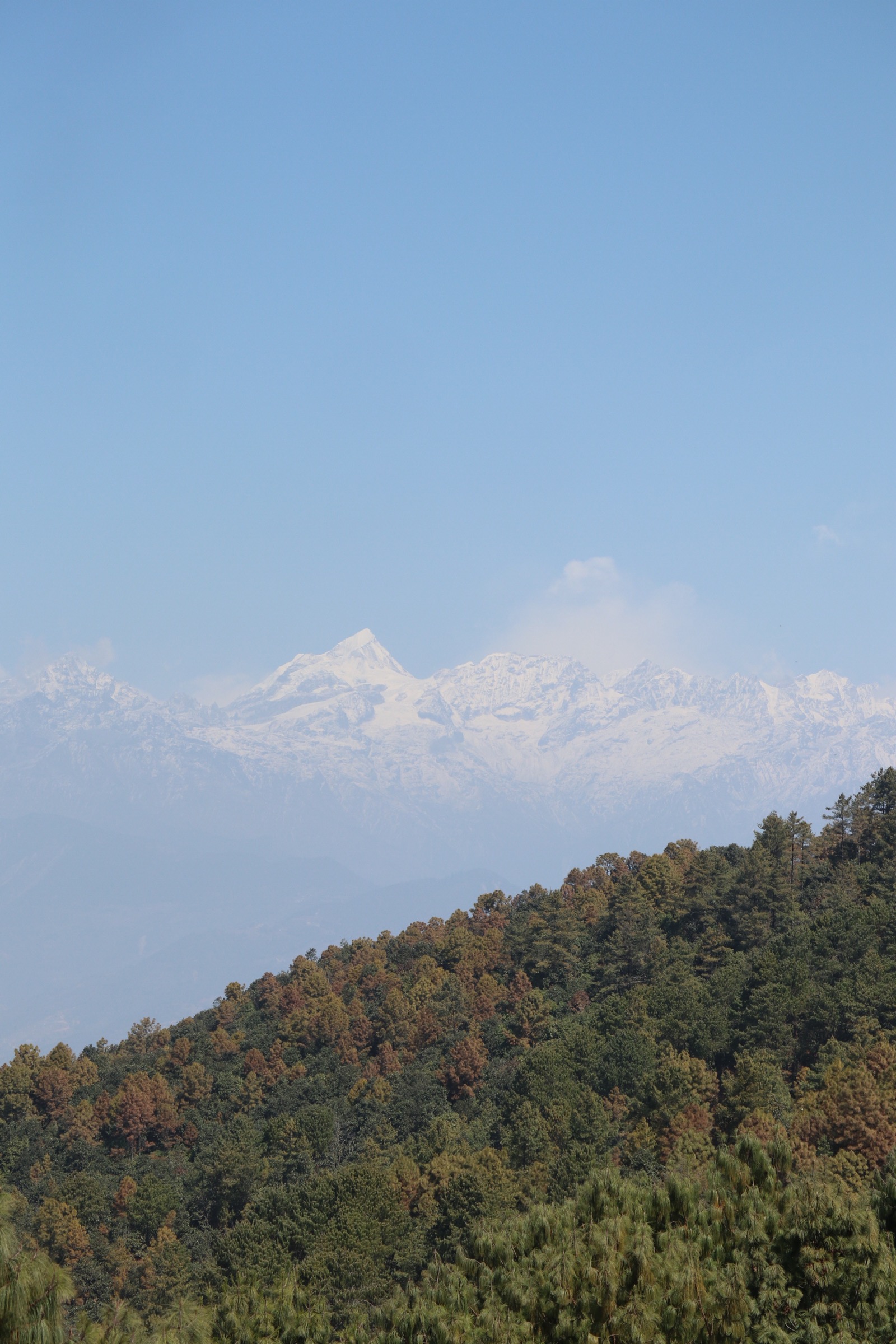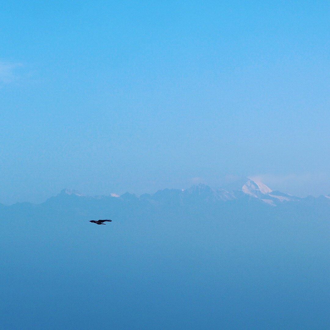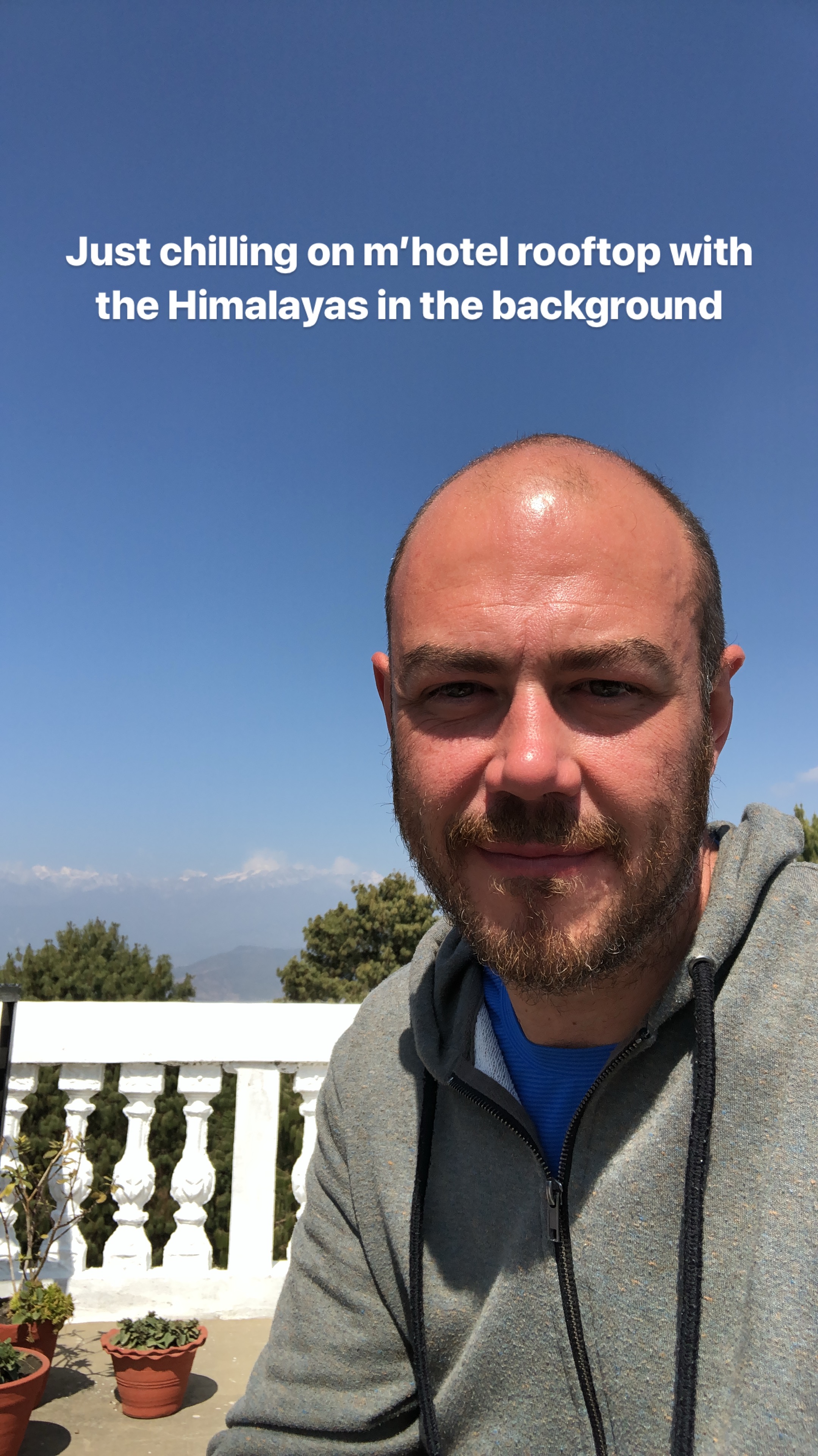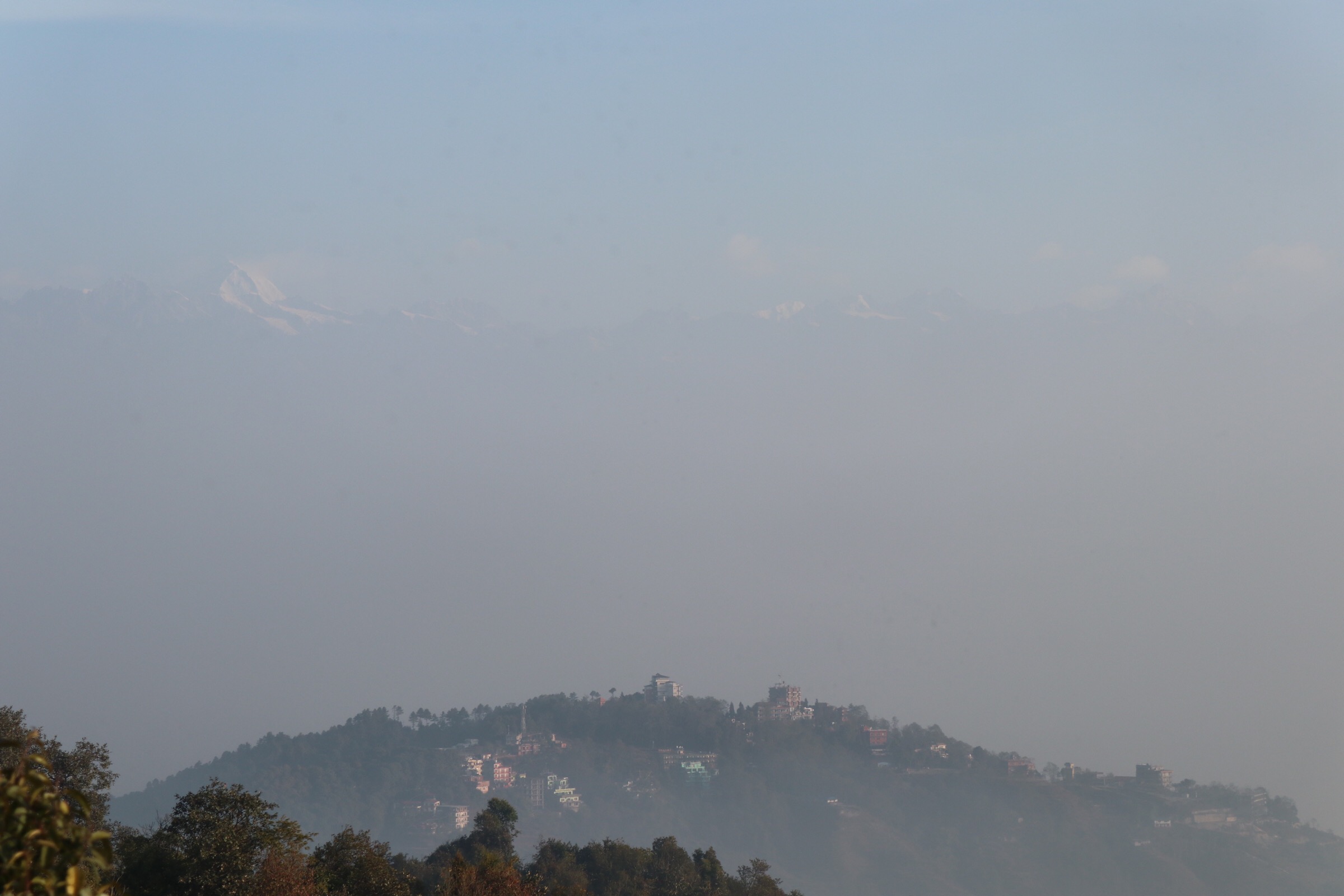 He gestures behind me, and I nod in agreement. Suddenly I’m taken aback. I’ve been looking straight ahead at eye level or down into the valley. I can see the buildings overlooking the valley, and it’s pretty. But as I raise my eyes and look up a little further, I suddenly see the snow capped summits of the ranges. With the haze across the valley, the colour of the mountains has melded in, but now that I see the snow capped ranges and just how clear and white and fucking tall they are, I’m gobsmacked. I’m standing here at 6 am on a Sunday morning in February, sweating in my coat from the climb, staring right at the Himalayas, and I hadn’t even noticed them.