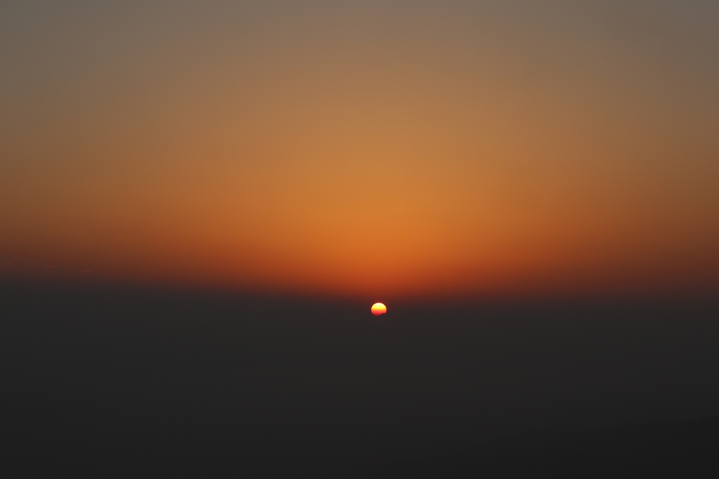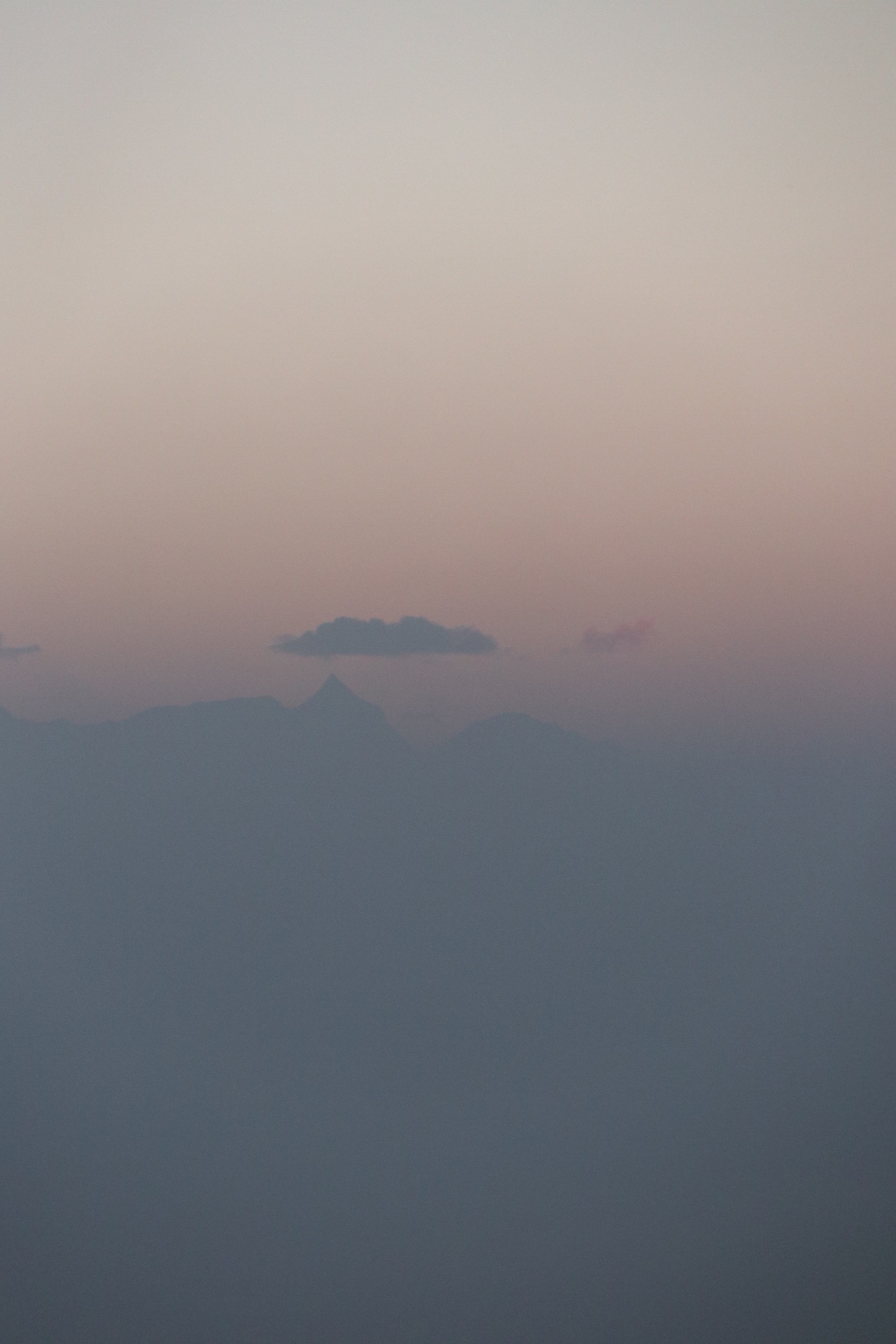 So far the climb hasn’t been too bad. Not so steep, anyway. I’m sweating slightly, but it’s manageable. We go around a hairpin and now dawn is breaking and the sky is lightening. I stop to take some photos of the silhouettes of the prayer flags against the sky, but Govinda is urging me on so that we get to the viewing point in time. From here the road steepens. He trots off up the incline, and I pant up behind him, slow and steady. I want to stop all the time and take photos of the breaking dawn.