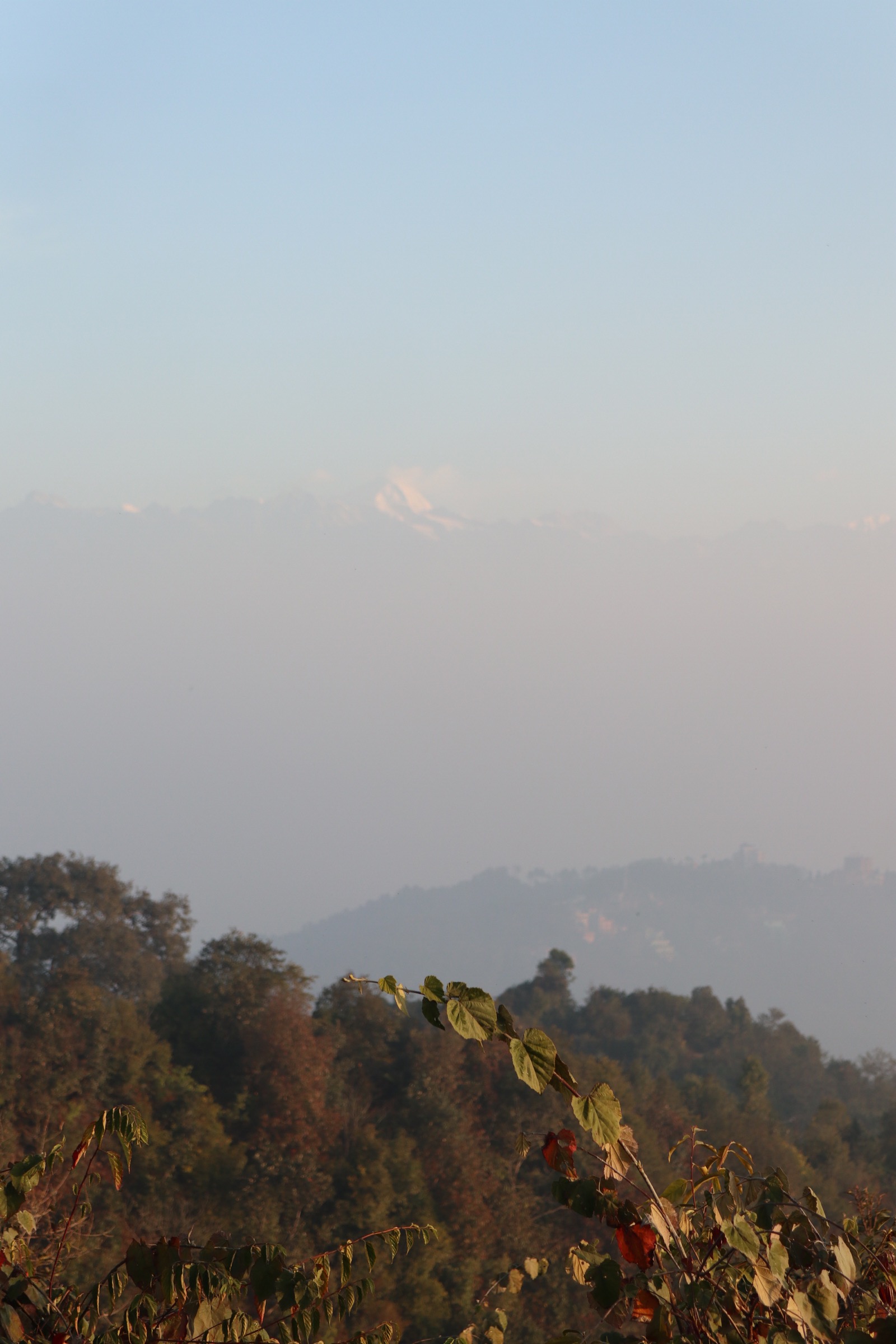 He points further up into the hills. In the light of the dawn I can see the viewing tower and a crowd of people around it. If you go there, Govinda says, you can get a decent view, but the trees interrupt it. Here, you get an unobstructed view across the valley and over to the mountains.