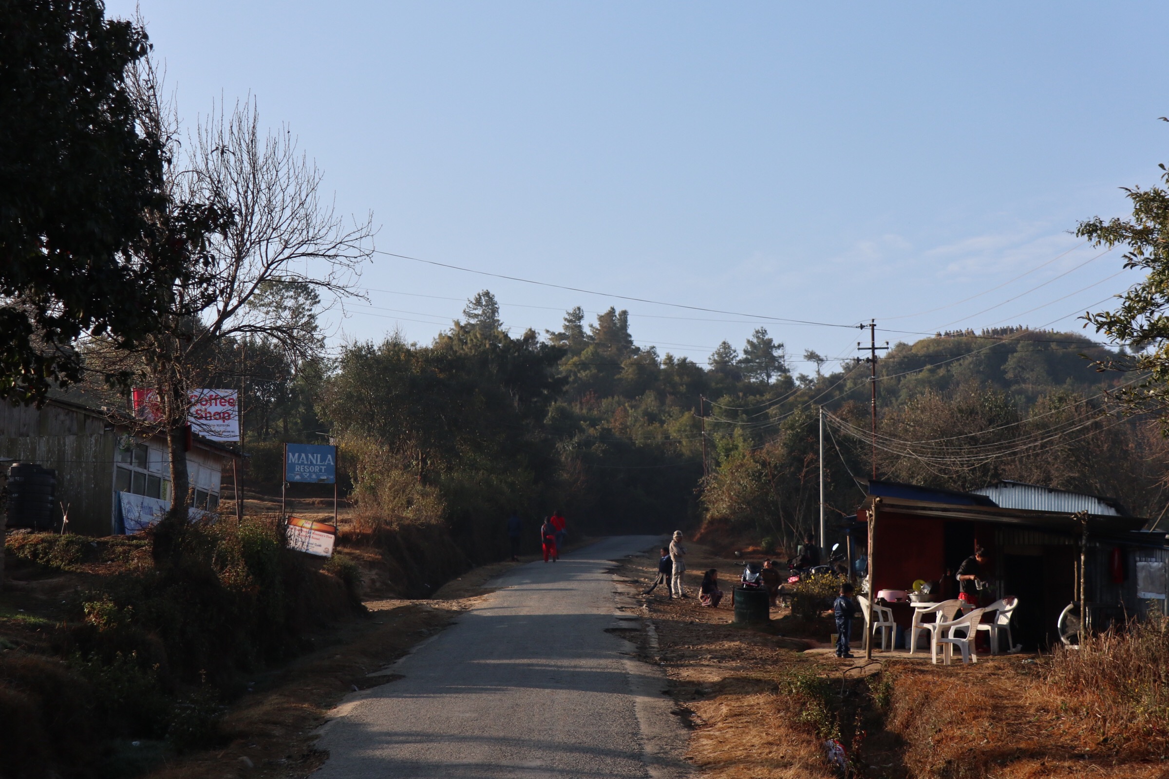 We continue along the road. It’s a straight path, pretty much, in that we don’t have to take any more turns. The road does wind up and around. We go past the large Nepal Army training barracks that is situated just outside of the town. Lights are on and jeeps are nearby and there is a guard standing at the barrier with a machine gun in his hands, which I always find quite intimidating. As we keep going on and up, a jeep comes barrelling by. It’s full of tourists driving up to the viewing point.