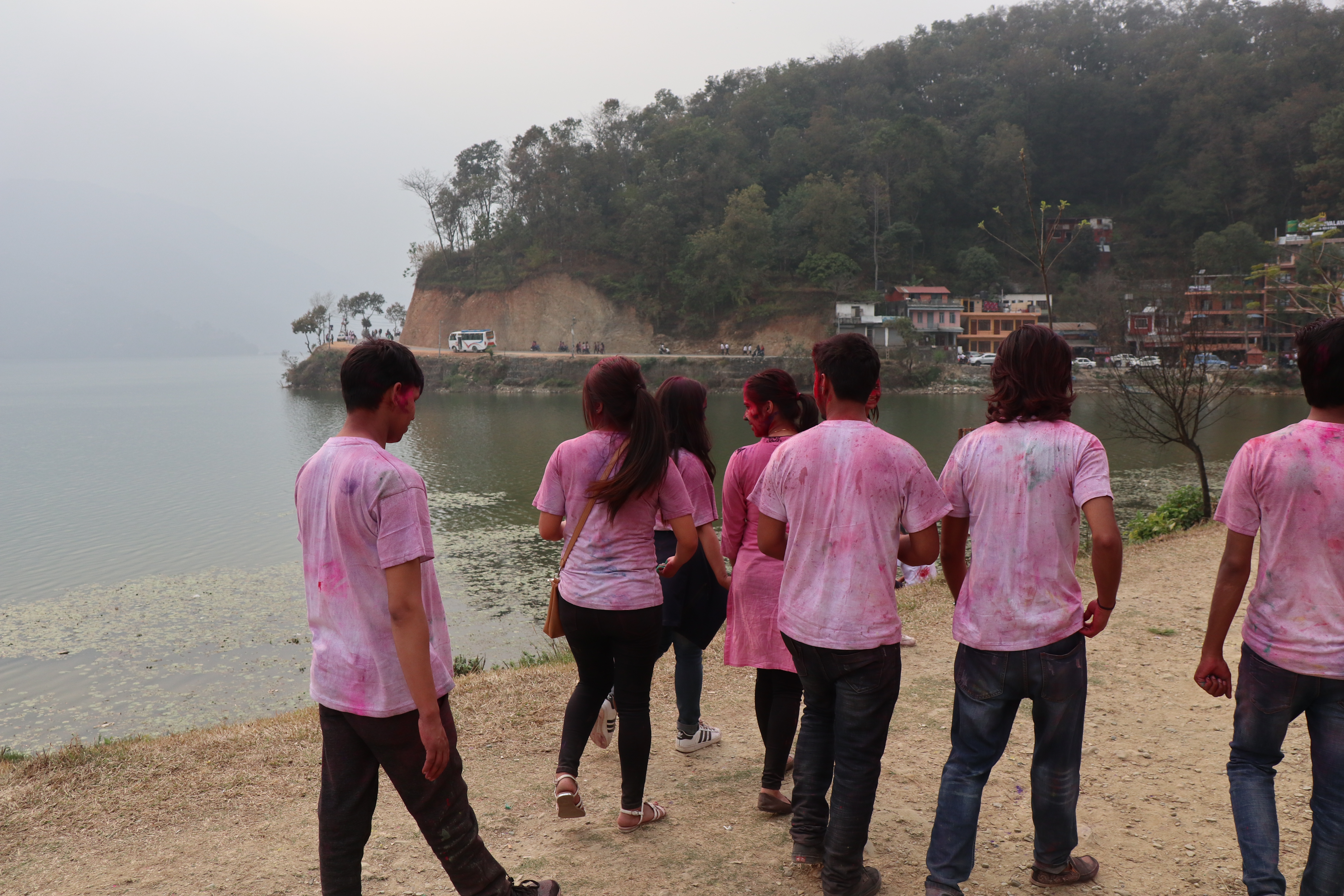 I keep walking. I walked the length of the main street yesterday when I came in from the bus station. It’s quite a long walk. I go past shops and restaurants and travel agencies. There’s a different feeling here than there was in Bhaktapur and Kathmandu. Maybe it’s being beside the water, but it feels more like there is a holiday vibe here. I’m kind of reminded a little of Indonesia in terms of the types of restaurants and bars that are here – it seems a lot more touristy. I see some kids loading their water guns from a bucket on the side of the road, and then I buy a multi-pack of gulal for myself. I’ve brought a bottle of water from the hotel, the cap of which I’ve pierced so that I can spray water myself.