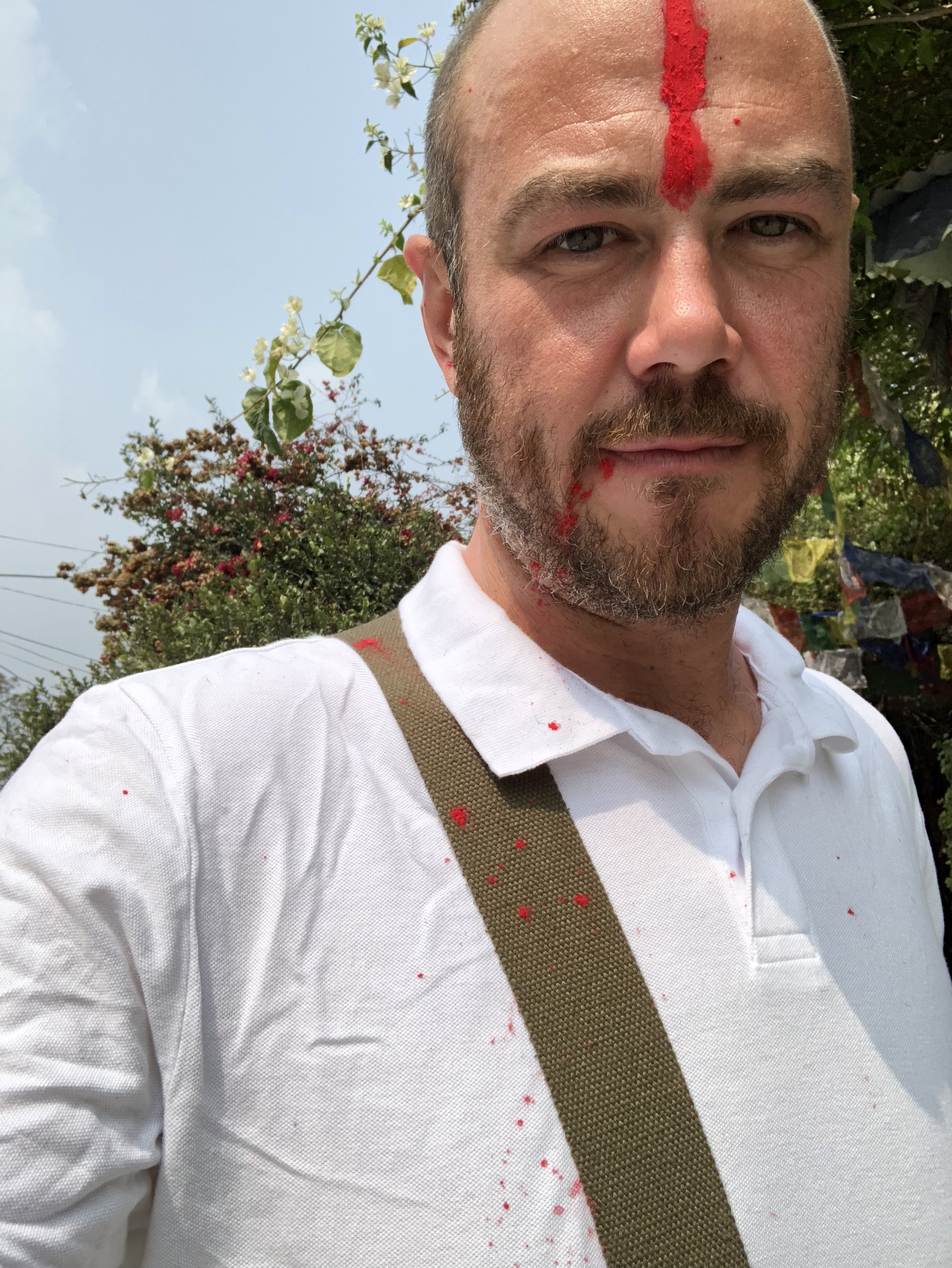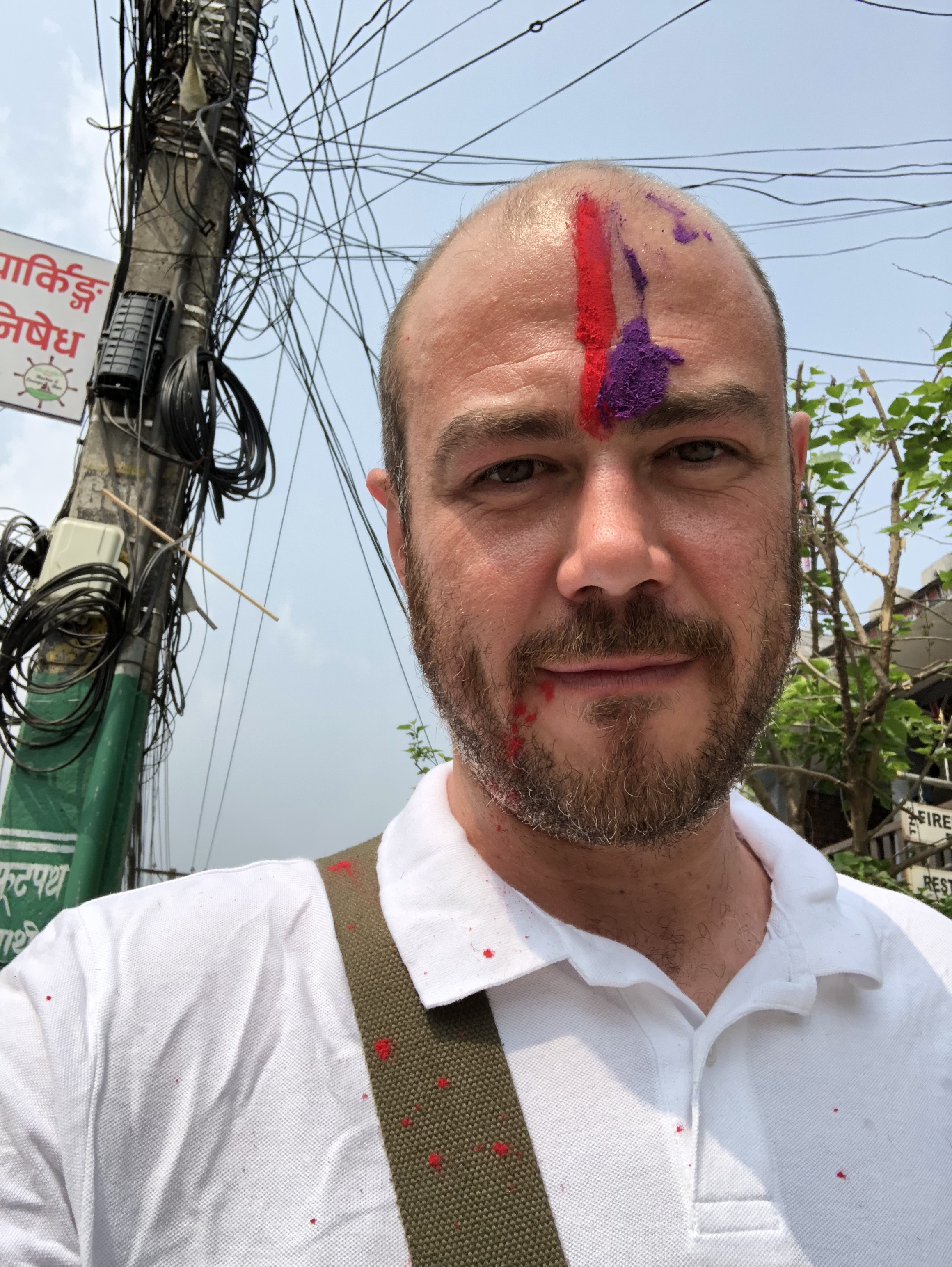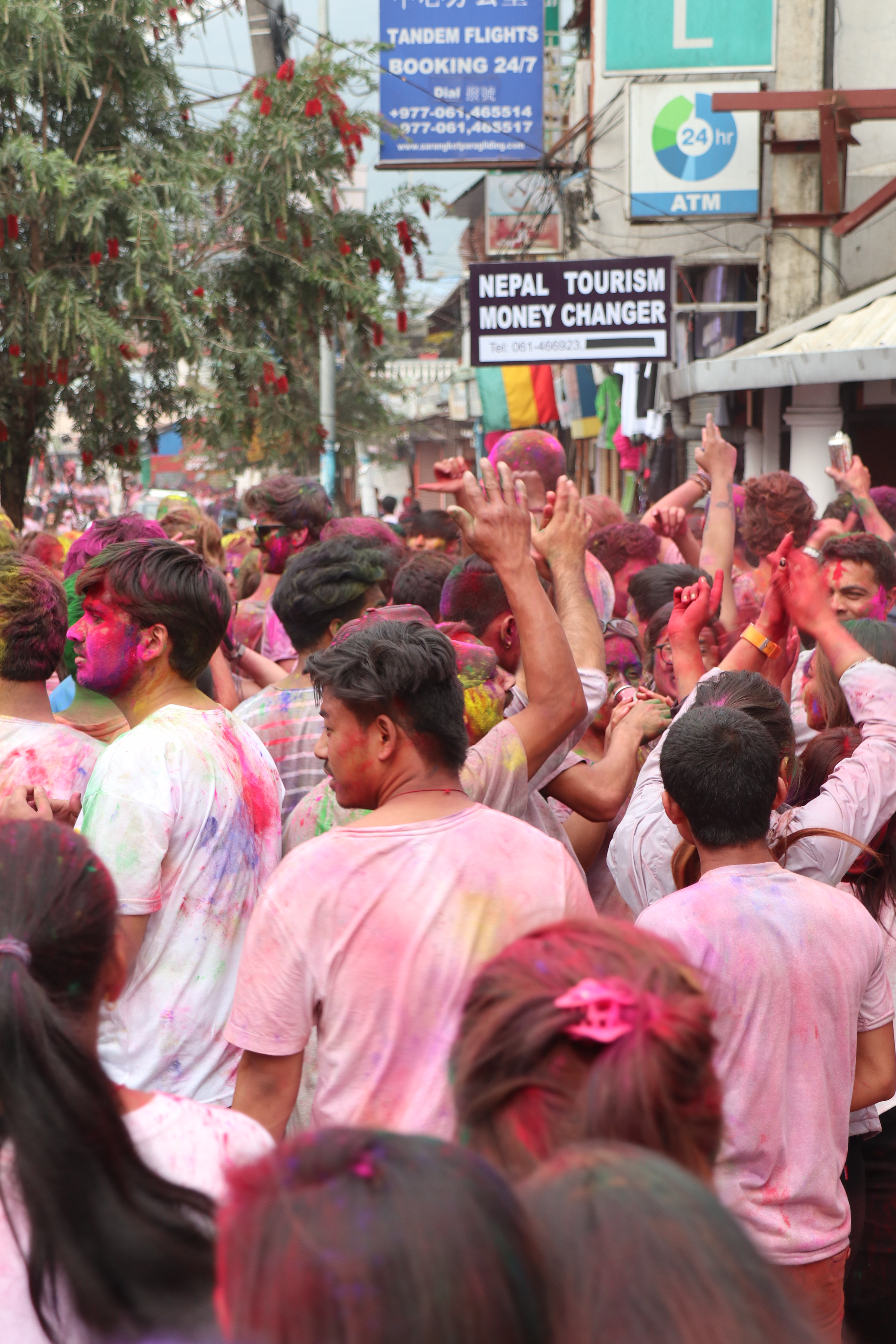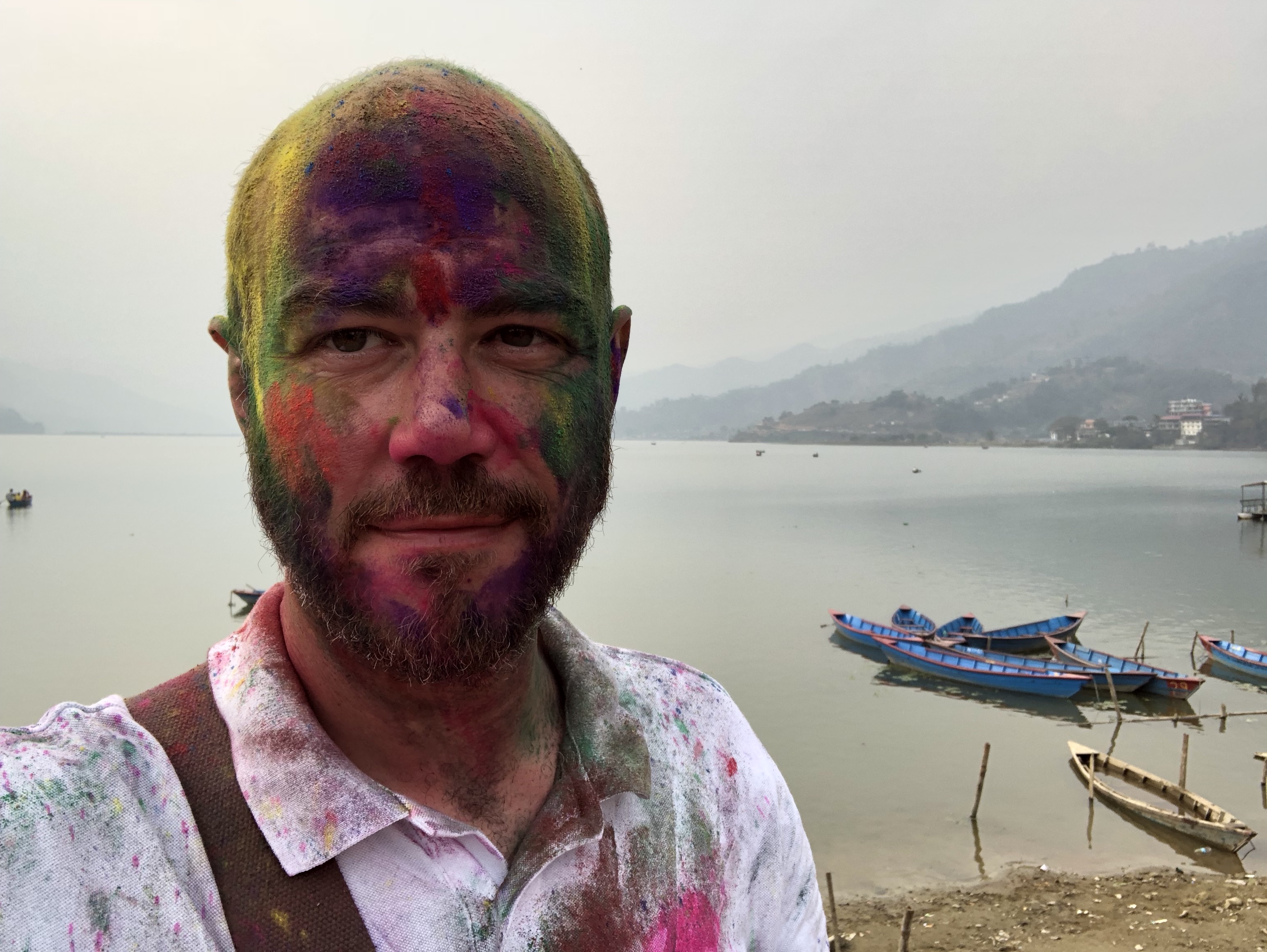 Today is Holi day. I’m excited to see the colours and the water and all the activity going on. I’m hoping I can get some cool pictures, of course. I’ve had a great breakfast on the rooftop overlooking Phewa Lake and I’ve heard music and activity blasting out somewhere, but nothing is happening yet. I spend a little time hanging about in my hotel room waiting for things to get going. Because it’s gonna get messy and colourful, I’ve decided to wear the one and only white polo shirt I’ve brought with me but haven’t worn yet, hoping it will show up all the colours.