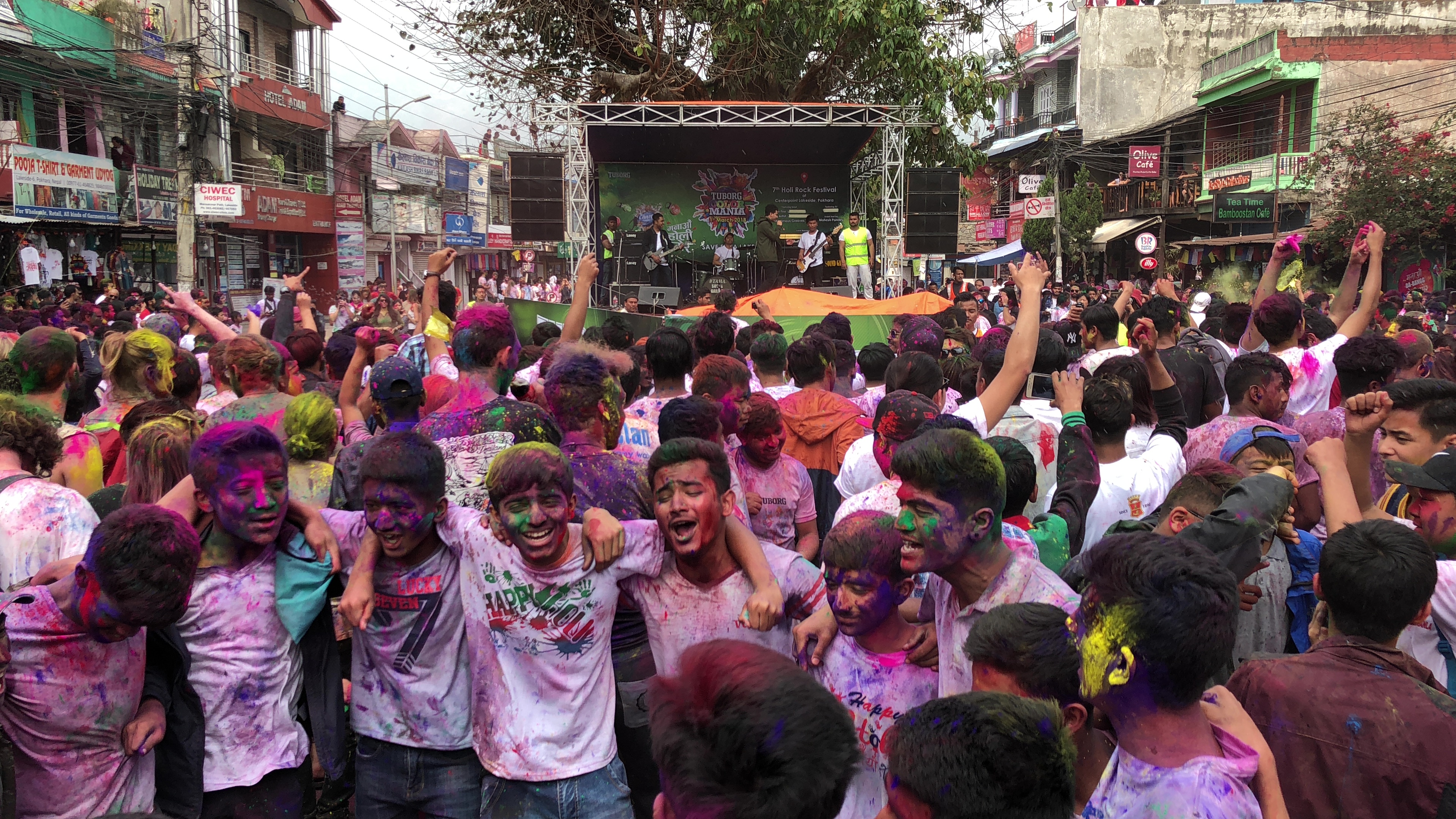 We wind up a mile or so later at the large stage set up outside my hotel. The parade joins a large crowd that has assembled here. A rock band is playing on the stage, and now everyone is dancing and drinking and having a good time. The band plays Smells Like Teen Spirit. Then they play a song in Nepalese and the whole contingent of Nepalese people goes wild. Groups dance together, people are moshing and singing along at the top of their voices. I have no idea what this song is or why they love it so much, but it’s a lot of fun to watch everyone enjoy themselves.