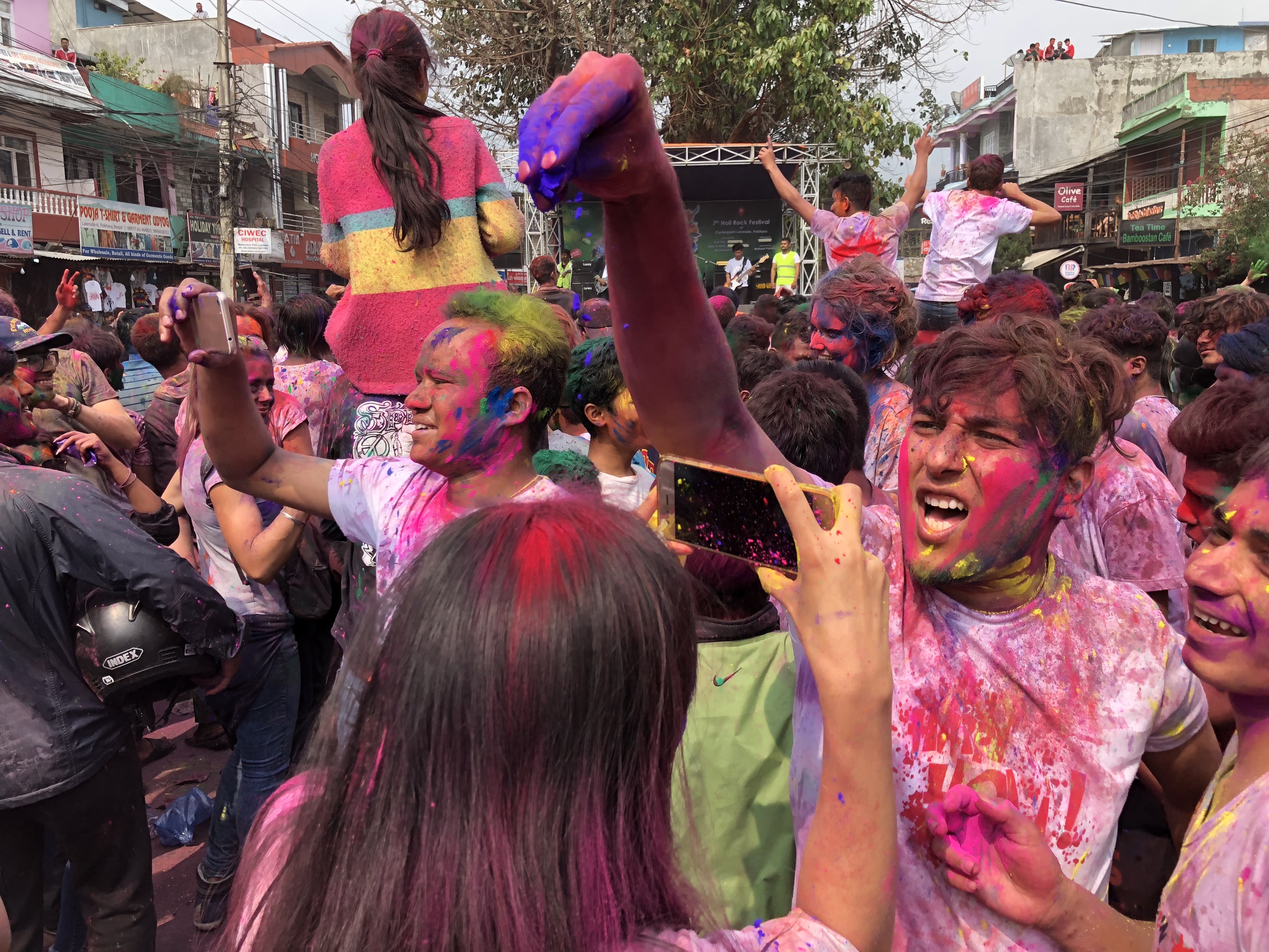 It’s past lunch time and I’m hungry, so I head off to get something to eat. I walk through the part of the town I haven’t been into yet today. The revelry continues, with groups of people daubing each other with gulal and yelling ‘Happy Holi!’ and dancing and enjoying themselves. Pockets of groups have congregated around trucks with sound systems on the back. A group of people are throwing buckets of water off a balcony and over passing motorcycles. Gulal is splattered everywhere. I even run into the Belgian couple that I chatted to the other day when we saw the sun rise over Mt. Everest. I eat and then I head down to the lake, where another stage has been set up, like at a music festival, and where groups of people are walking around.